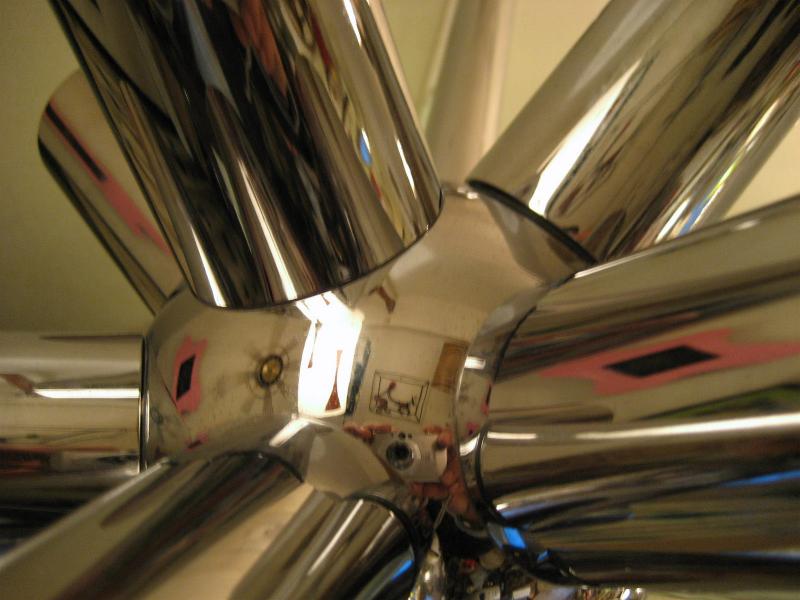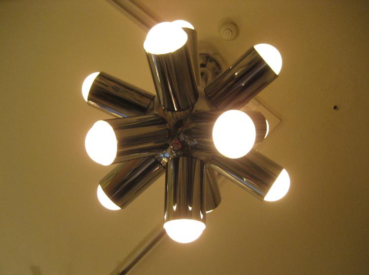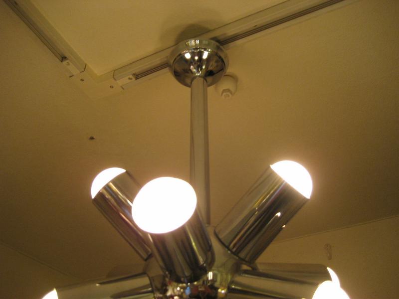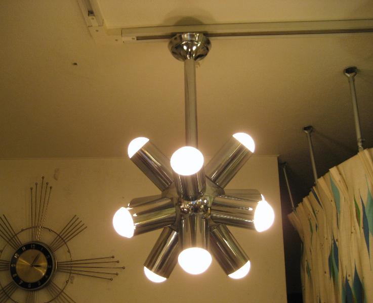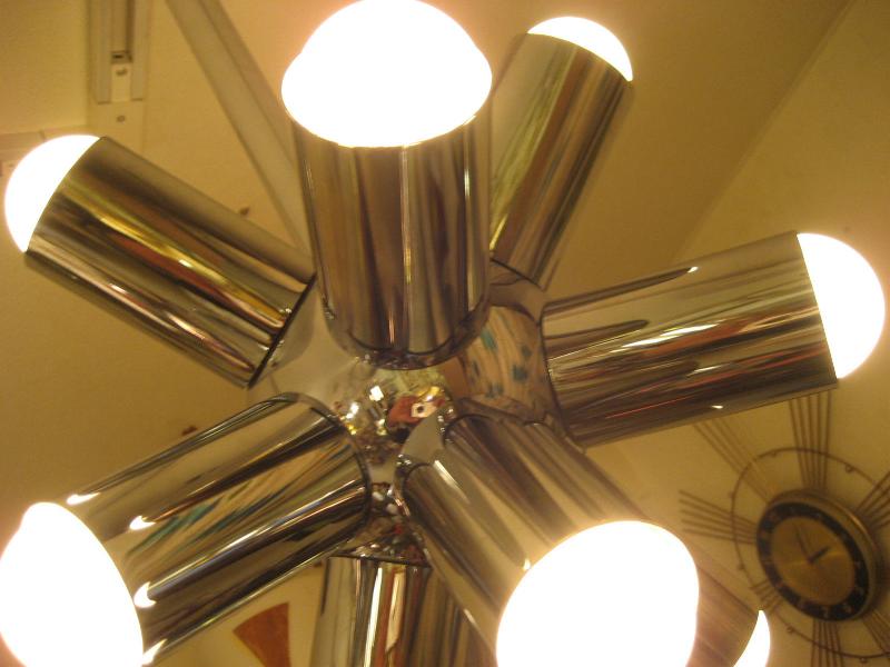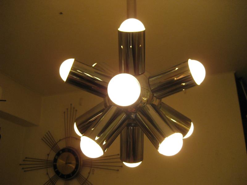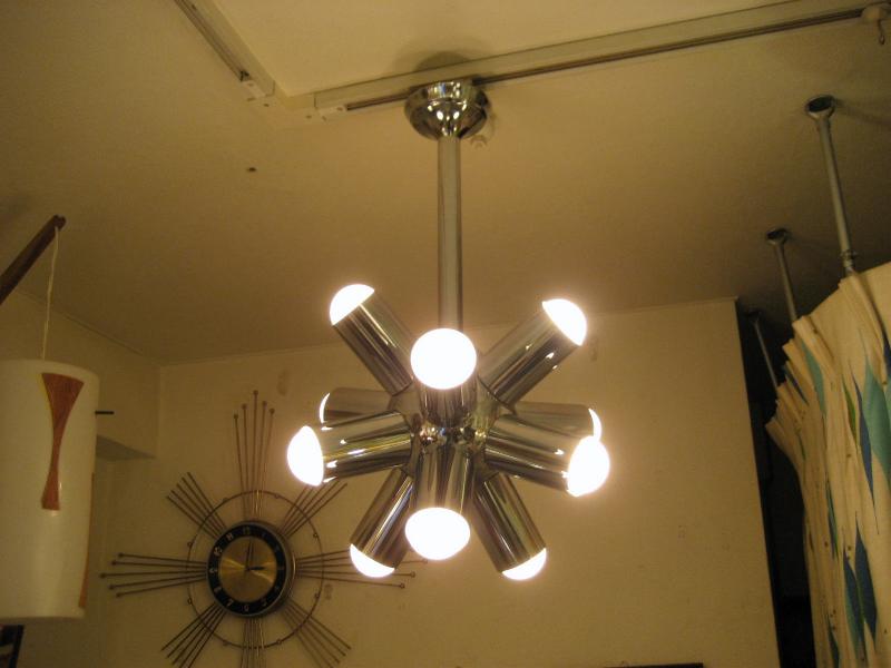 | ビンテージスプートニクランプ 60年代 USA. 12灯タイプ クロームメッキ仕上げのテトラポットライクなアトミックシーリングランプです。直径約5.5cmの極太ソケットカバーがセンター球体から直接12本飛び出しているタイプ。とてもスペーシーでクールなGOODライティングピースで、お部屋の雰囲気一発で変わります! 電源は家庭用引っ掛けシーリングに交換済ですのでかんたん設置、すぐに使用できます。 ※電球は日本で市販されているボール球を使用しております(現状10W x 12個) |