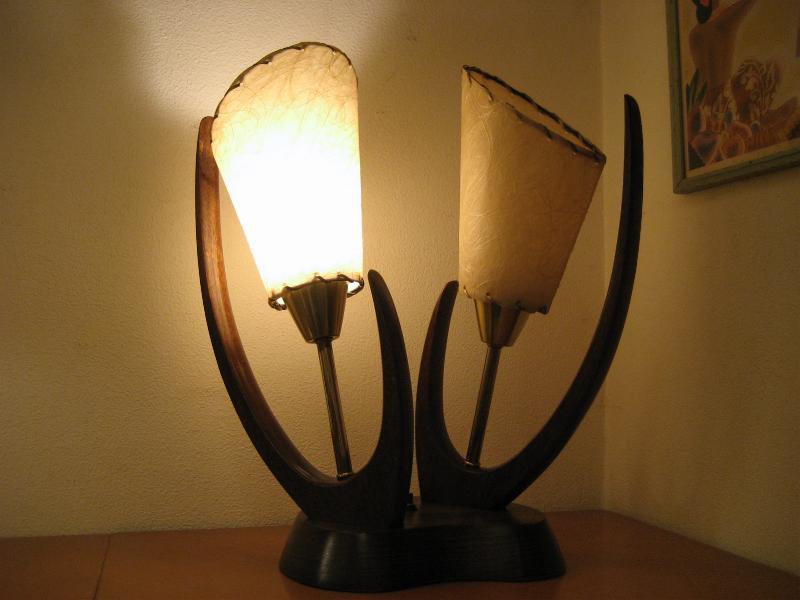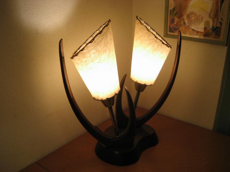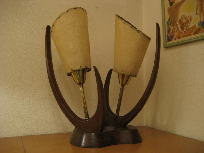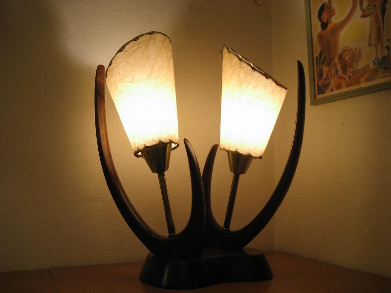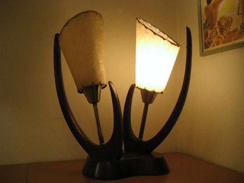 | ビンテージアトミックダブルシェードランプ / 50年代 USA. WOODメイドのブーメランベースとブーメランシェイプデコフレームがクールなアトミックシェードランプ。シェードはファイバーグラスメイド。クールでGOODなアクセントライティングピースです! 電源は家庭用コンセント対応コードで、スイッチはベースに付いていてプッシュタイプの3Way(左・右・両方・OFF)。 |