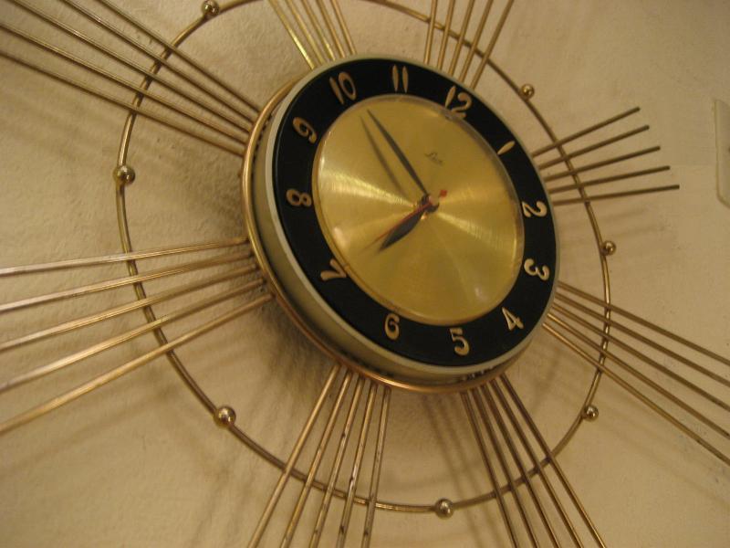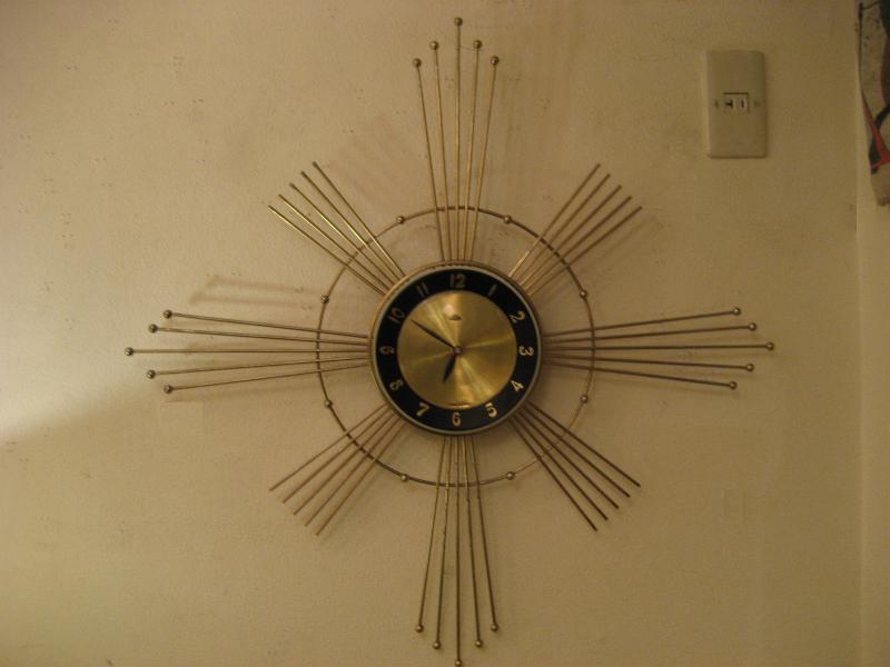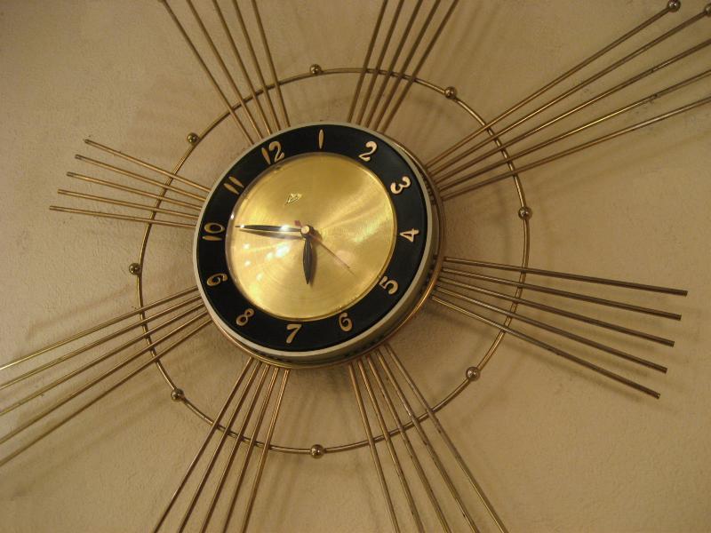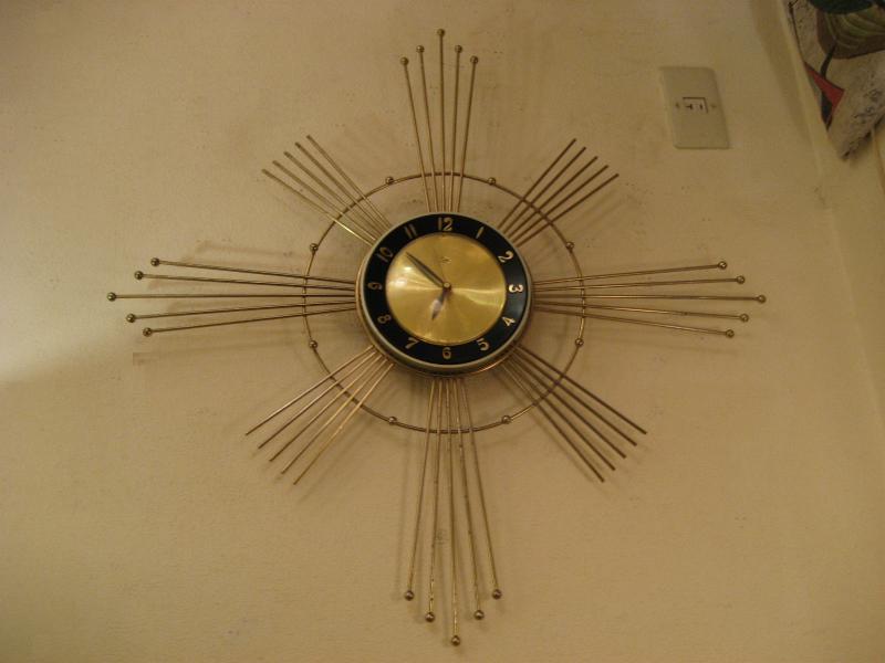 | ビンテージスターバースト/サンバーストウォールクロック / 50-60年代 LUX社, MADE IN USA. ゴールドブラスのスターバーストスポークがクールな壁掛け時計。文字盤も黒金カラーでクール&GOODなアトミックタイムピースです! ムーブメントはバッテリータイプ(単3x1個使用)に交換済みでですので時間は正確です。 |