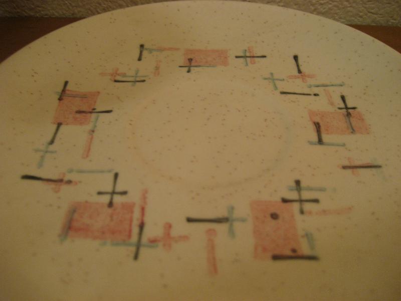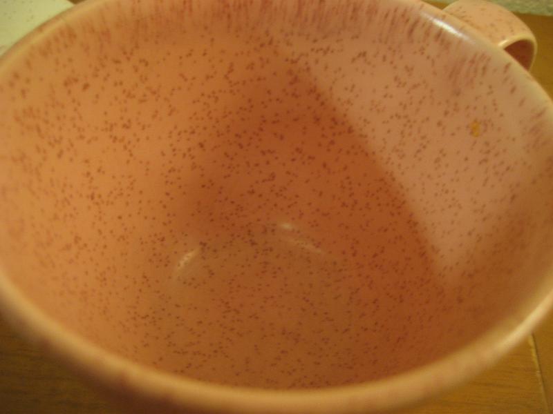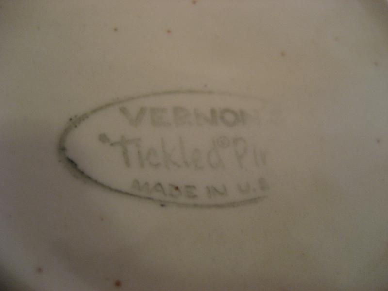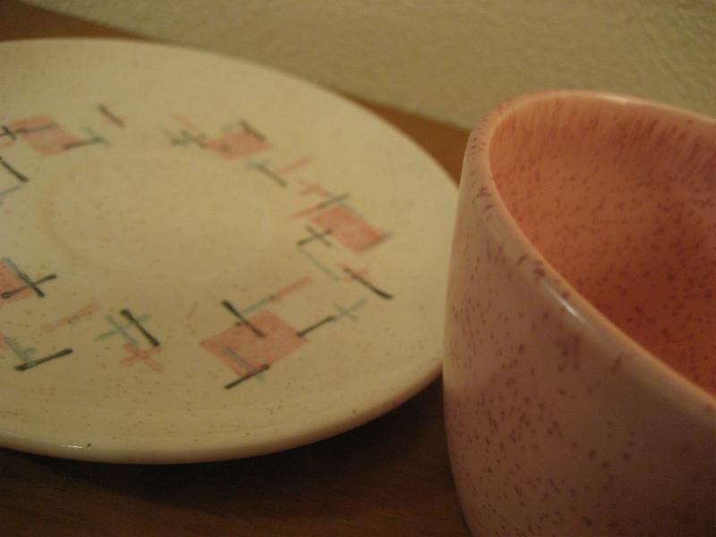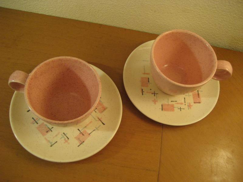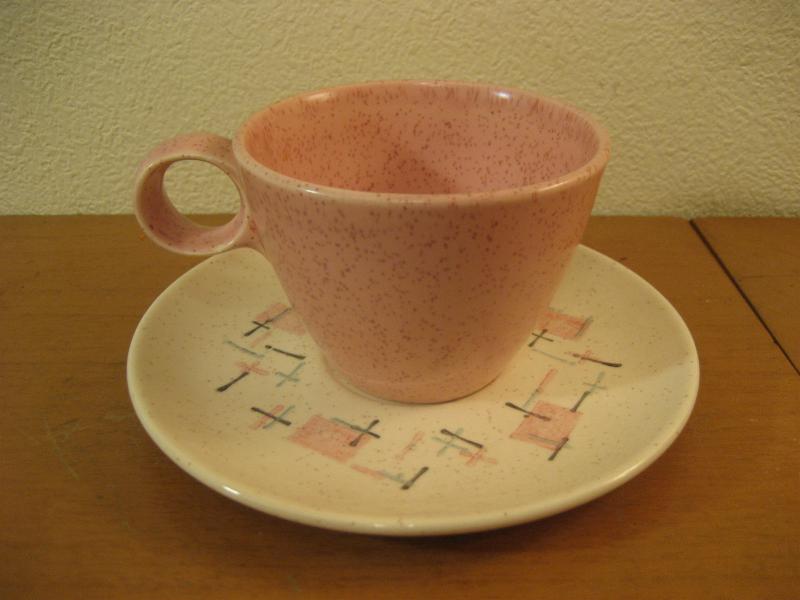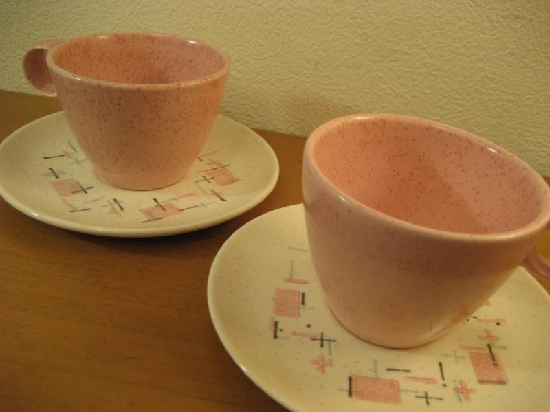 | ビンテージカップ&ソーサー / 50-60年代 バーノン社製 USA. カリフォルニア陶器メーカー、バーノン社を代表する "ティクルドピンク" シリーズのカップ&ソーサーセット。 50年代中頃から60年代初頃まで生産されていたようで、ソーサーはオフホワイトベースにピンク・ブルー・ブラックのカスリ調、カップはピンクの単色というコントラストがクールでキュート。ティータイムを楽しくしてくれるGOODテーブルウェア! ◆◇◆バックスタンプについて◆◇◆ カップにはどちらもマークはありません ソーサーのマークは2種類で若干年代の違いがあると思われますが、大きな違いはないと思います。 |
