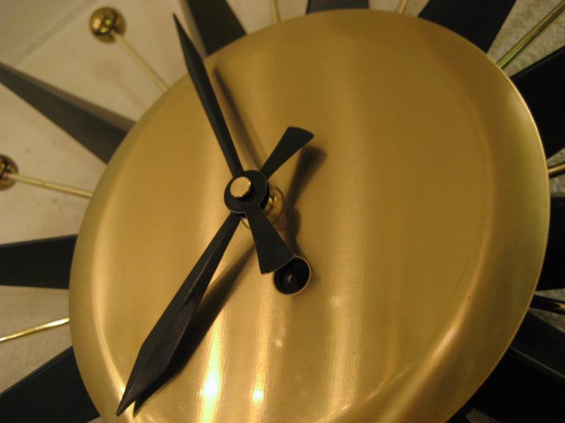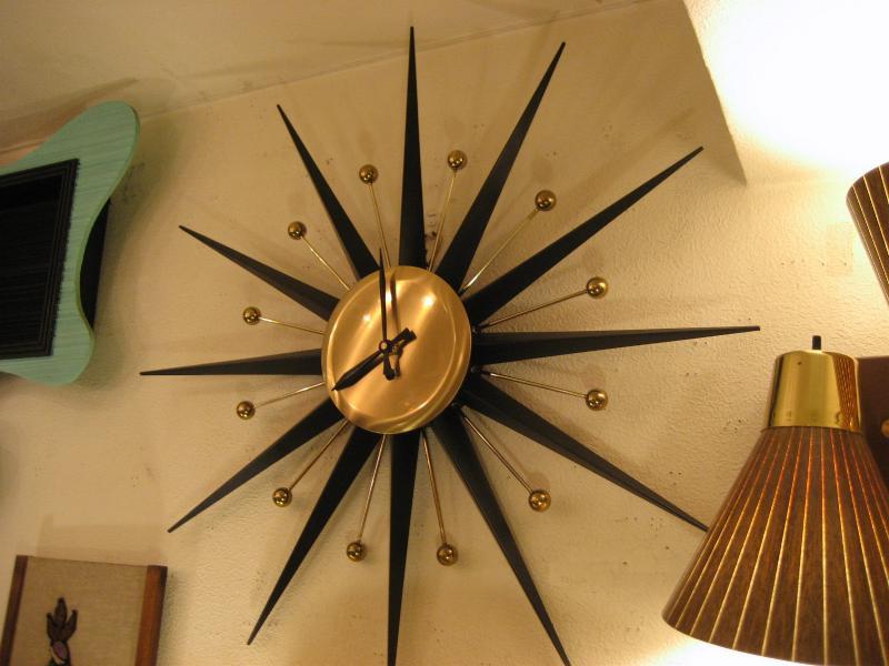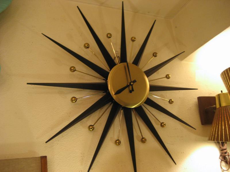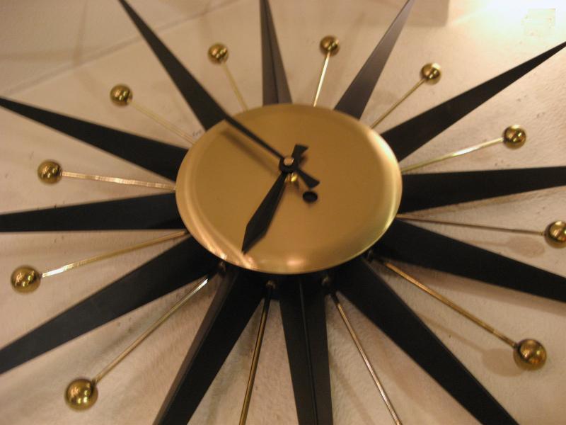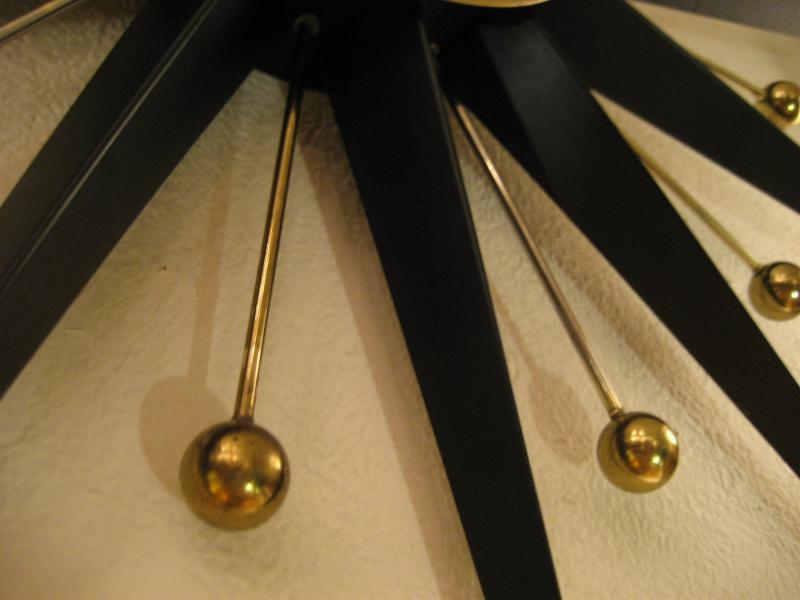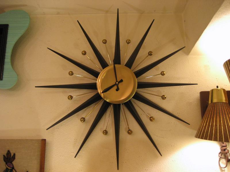 | アトミックスターバーストウォールクロック / 50年代 USA. ダイヤルなしのゴールド文字盤にブラックハンドがクールなスターバースト壁掛け時計。フレームはブラックとゴールドのツートーンでブラスメイドのスプートニクスポークアクセント。 ムーブメントはバッテリータイプ(単3x1個使用)に交換済みですので時間も正確です。 |