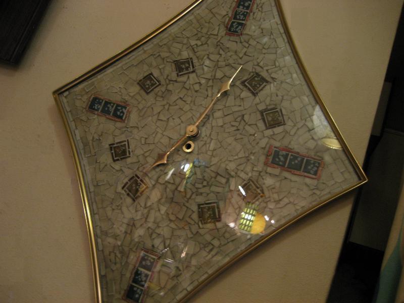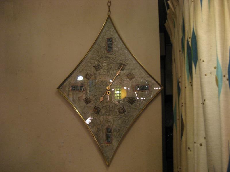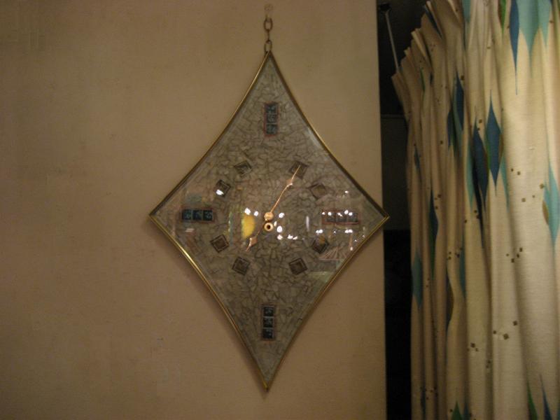 | ビンテージアトミックウォールクロック / 50-60年代 ターナーウォールアクセサリー社 USA. シャドウボックスやウォールデコなど壁装飾アイテム専門の老舗メーカー、ターナー社のビンテージ壁掛け時計。ダイヤシェイプでゴールドメタルフレームにフロントガラスパネル、バックグラウンドはフェイクタイル調のモザイクデザイン。クールなGOODタイムピース! ムーブメントはバッテリー式(単3x1コ使用)に交換済ですので時間は正確です。 |