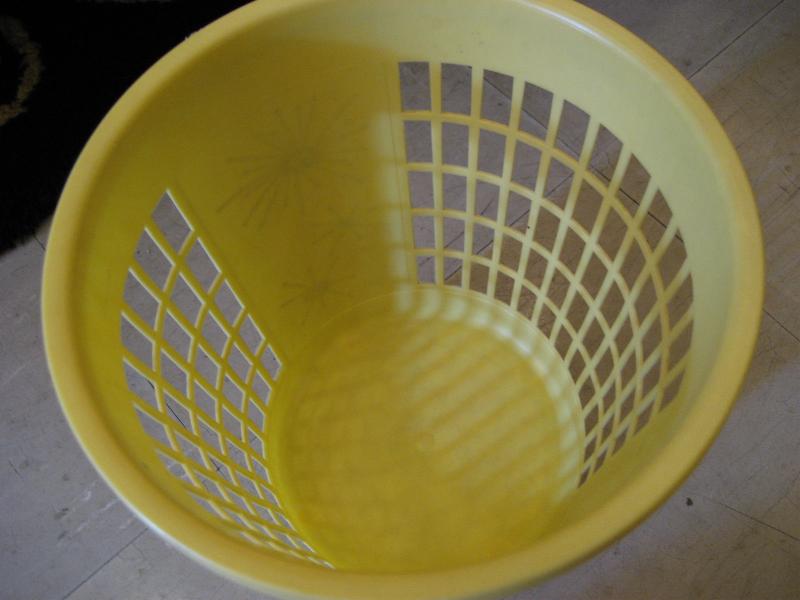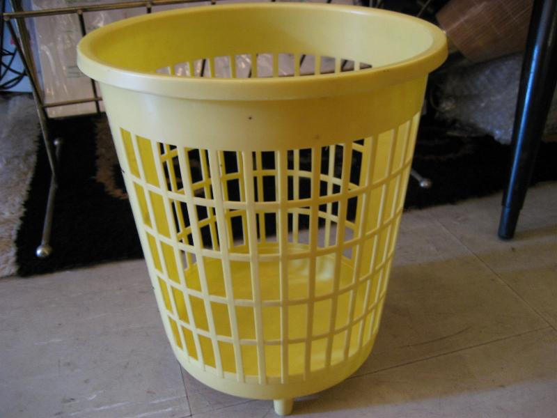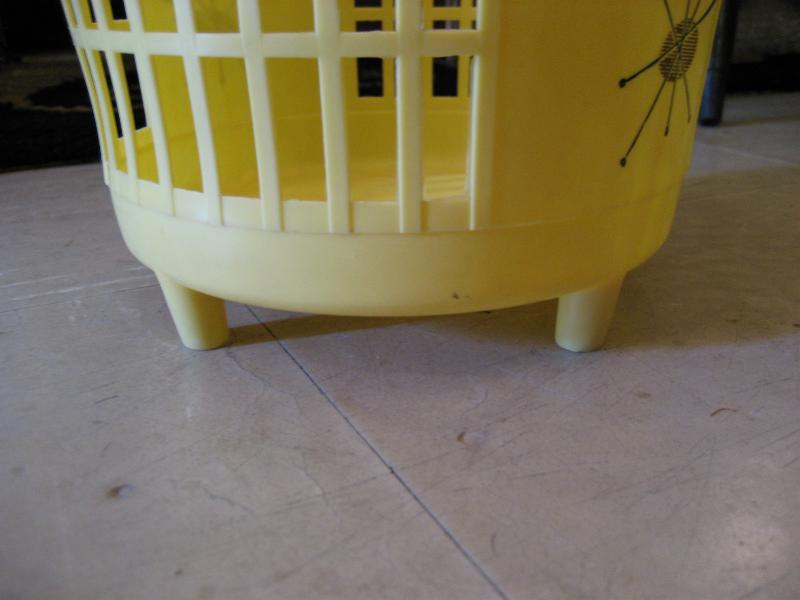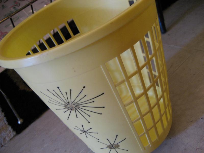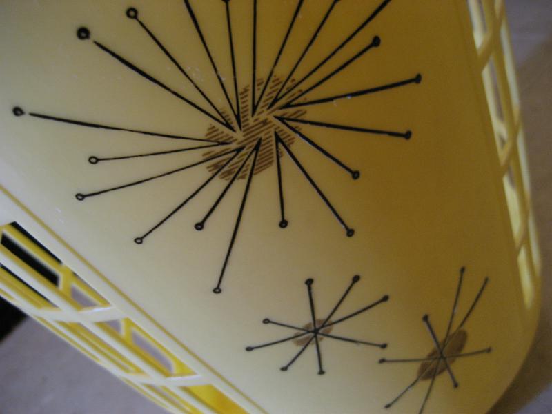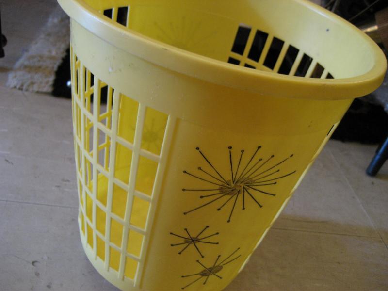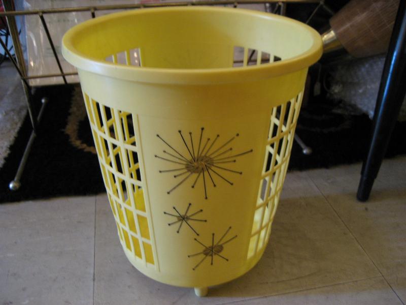 | ビンテージアトミックトラッシュボックス / 50-60年代 USA スターバーストプリントでサイドメッシュタイプのビンテージゴミ箱です。イエロープラスチックメイドで底面は3本足付き。ドレッサーサイドなどにGOODなクールバニティピース! |