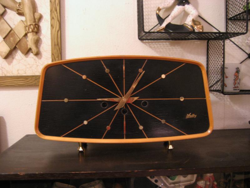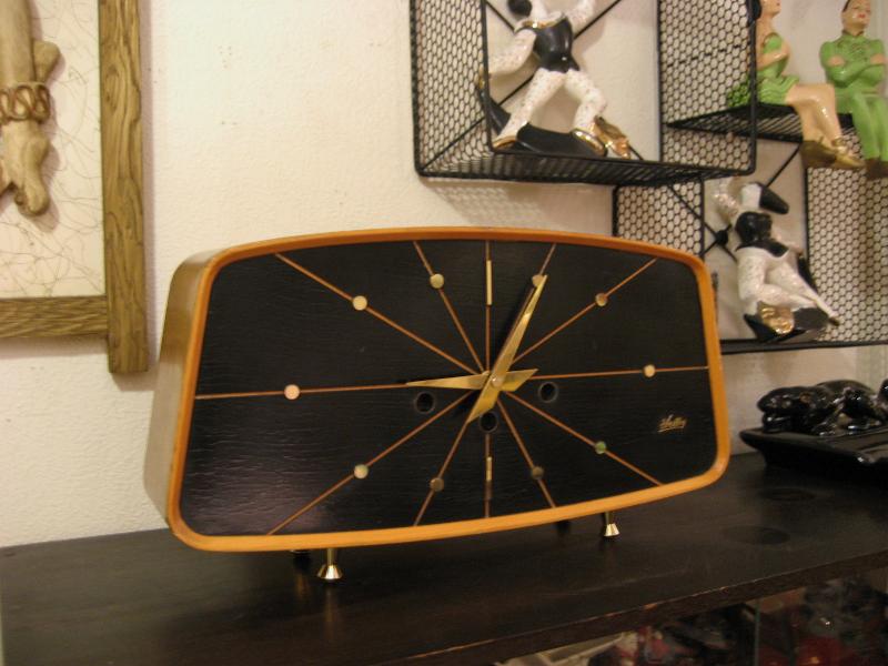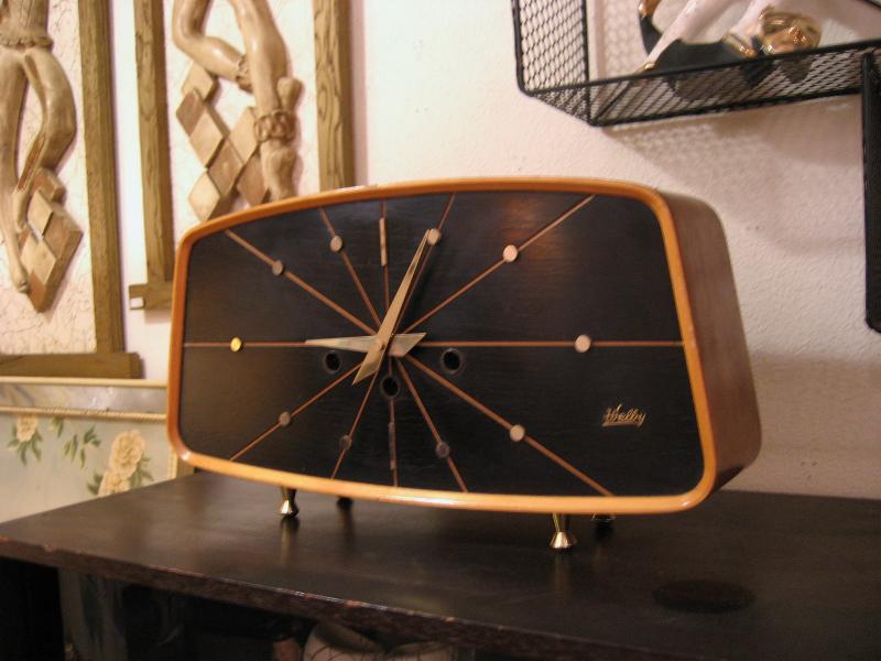 | アトミックシェルフクロック / 50年代 WELBY社, MADE IN GERMANY. ウッドボディでクールなブラックフェイスのビンテージクロック。文字盤がスターバーストタイプ、シンプルで見やすいデザイン。4本レッグはスプートニクアームシェイプ。クールでGOODなビンテージタイムピース! ムーブメントはバッテリー式(単3x1コ使用)に交換済ですので時間は正確です。 置時計としては大き目の存在感あるワイドサイズです。 |