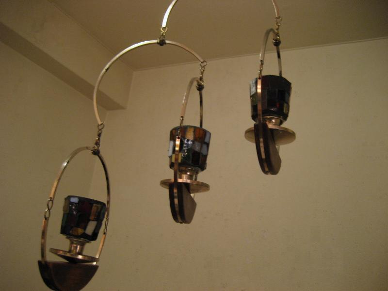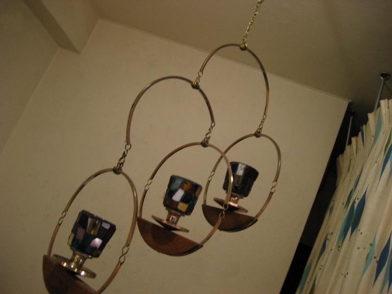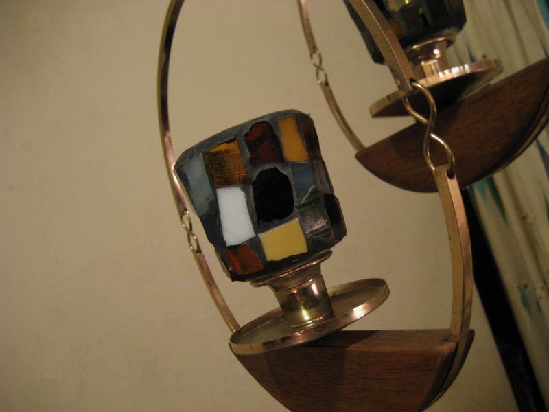 | ビンテージモダンキャンドルシーリング / 60年代 USA 天井シーリングタイプの3連キャンドルホルダーです。モビールデコレーションのようなデザインで、バランスダウンされた3個のラウンドフレーム下側はチークウッドデコ、中心にステンドグラス調のガラスメイドキャンドルホルダーカップ。モダンでGOODなミッドセンチュリーデコレーションピース! |