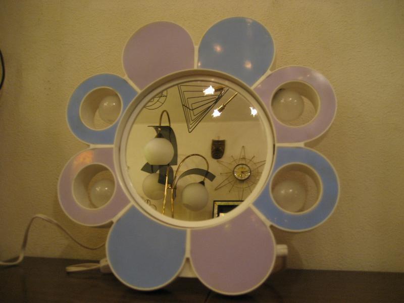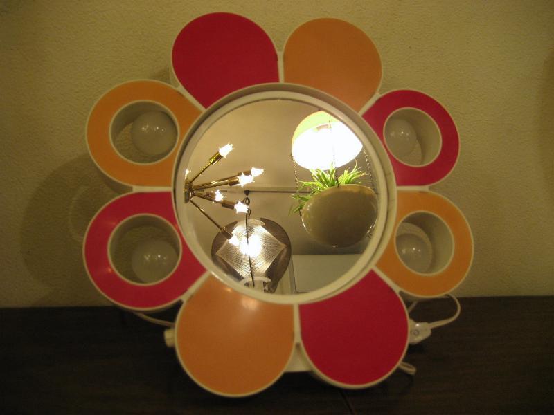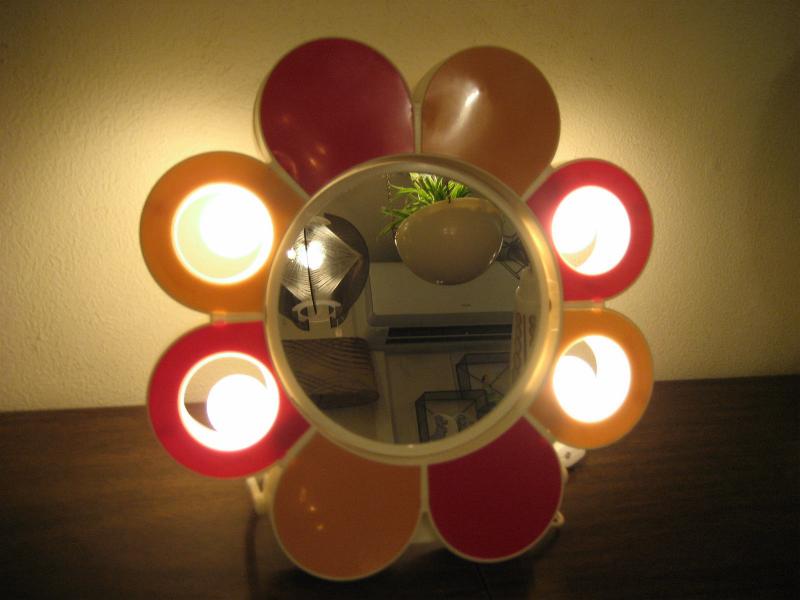| ビンテージライトアップメイクアップミラー / 60-70年代 USA 2タイプのカラーが楽しめるフラワーデザインのメイクアップ用ミラーです。サイドの花びら部分のランプが4個付いていて点灯します(電源は家庭用対応コードでスイッチはコード中間に付いています/電源コードは収納可)。 鏡はフラットフェイスと凹面鏡(クローズアップ用)の2種類で回転可能。キュートでGOODなビンテージバニティピース! |