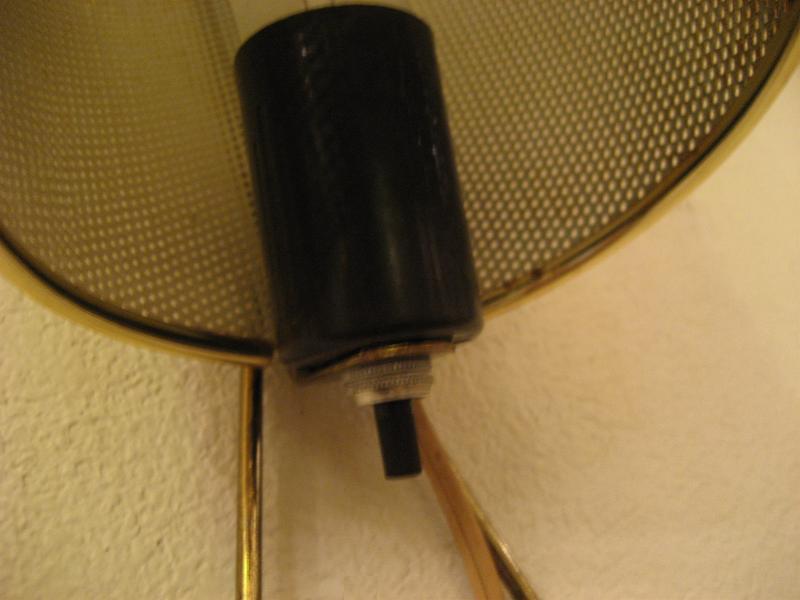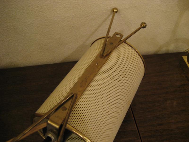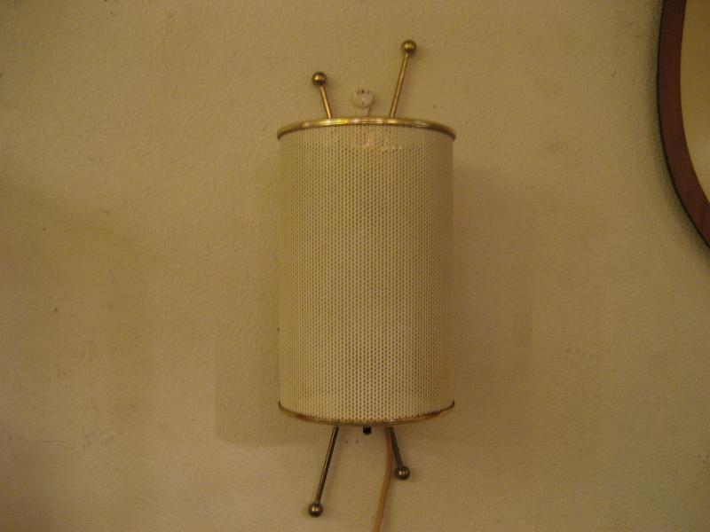 | アトミックビンテージウォールランプ 50-60年代 USA. バックにスプートニクデコが付いたビンテージ壁掛けランプ。シェードはオフホワイトカラーのメッシュシリンダータイプ。クールでGOODなアトミックライティングピース! 電源は家庭用コンセント対応コードで、スイッチはソケット後部に付いています。 |