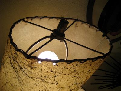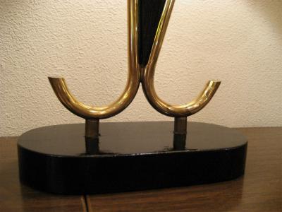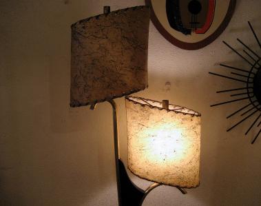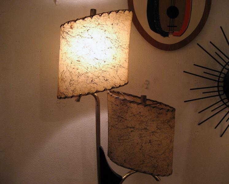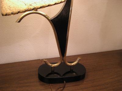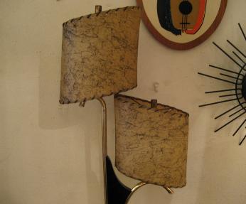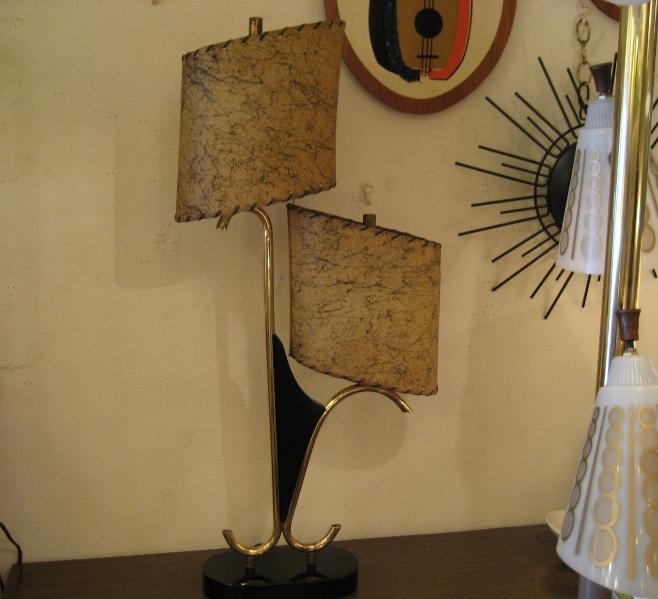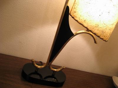 | アトミックビンテージシェードランプ / 50年代 USA. ダブルシェードのビンテージマジェスティックシェードランプ。シェードはオーバルシェイプでブラックドレーピング。同じくオーバルシェイプのウッドベースにゴールドブラスアームとブーメランデコレーションアクセント。超クールなテーブルライティングピース! 電源は家庭用コンセント対応コードでスイッチは各ランプソケットに付いていてスライドタイプ。 |