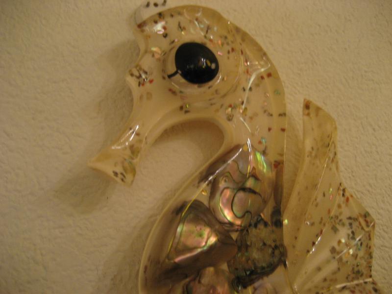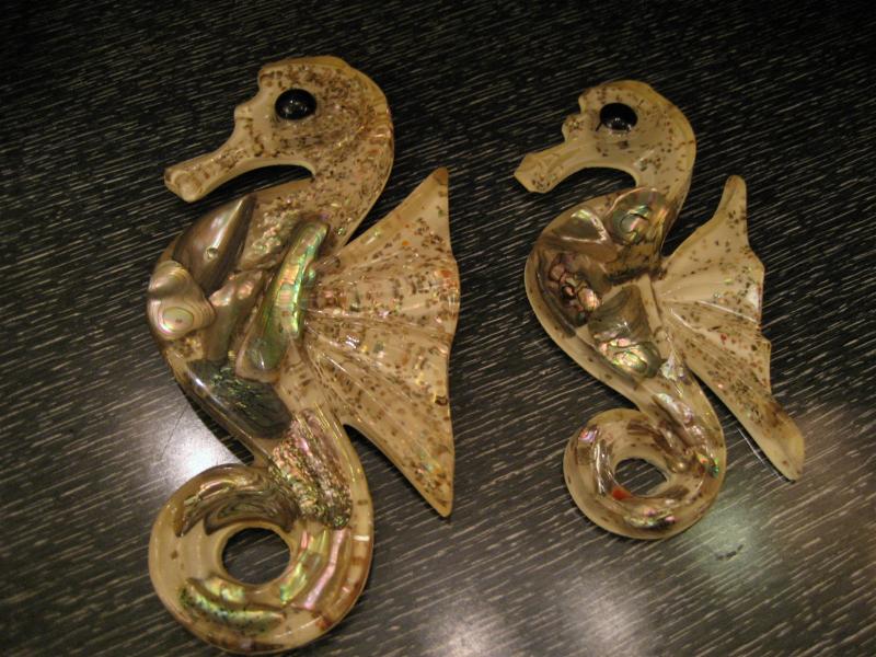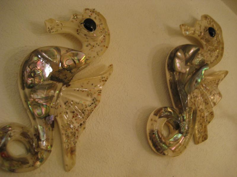 | ビンテージペアシーホースウォールデコ / 50-60年代 カリフォルニア, USA アクリル樹脂メイドのタツノオトシゴ壁掛けセットです。バックベースはオフホワイトにクリアアクリルボディカラーで内側は貝殻アクセント。キュートでGOODなビンテージウォールデコレーションピース! |