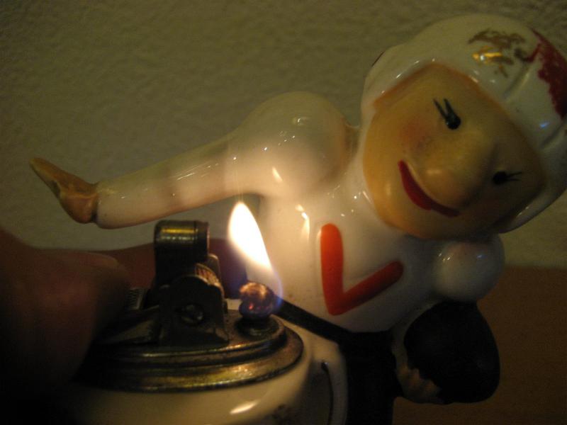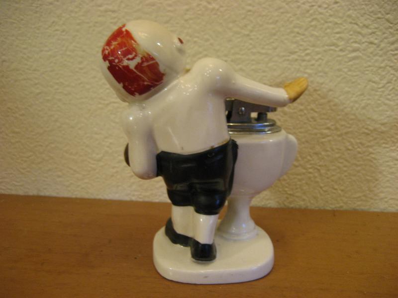AMICO INPORT, MADE IN JAPA. フットボールプレーヤーシェイプの卓上オイルライター。優勝カップにライターがはめ込まれているデザイン(着脱可)。ライターもきちんと点火します(写真参照)。ディスプレイとしてもGOODなビンテージテーブルピース! |