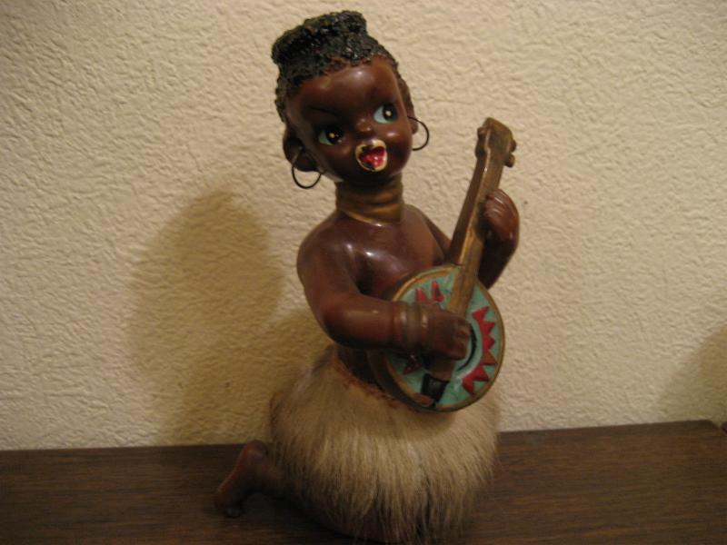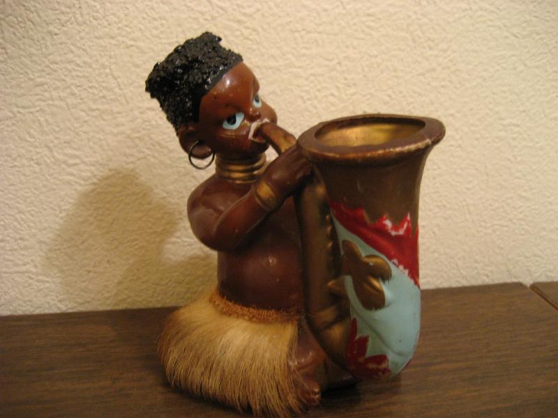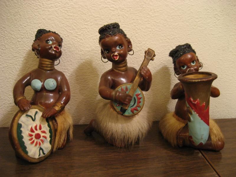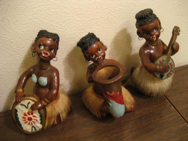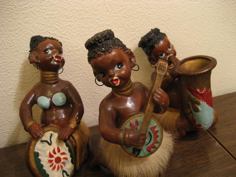 | ビンテージブラック置物3pcセット / 40-50年代 USA. 陶器製のブラック置物セットでミュージシャンシリーズ。民族打楽器、弦楽器、管楽器をそれぞれ演奏していて耳にワイヤーイヤリング、腰ミノ付きです。ディスプレイにGOODなビンテージデコレーションピース! |