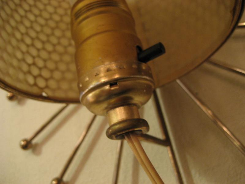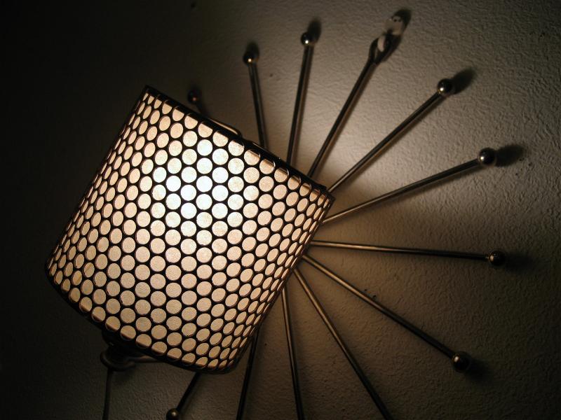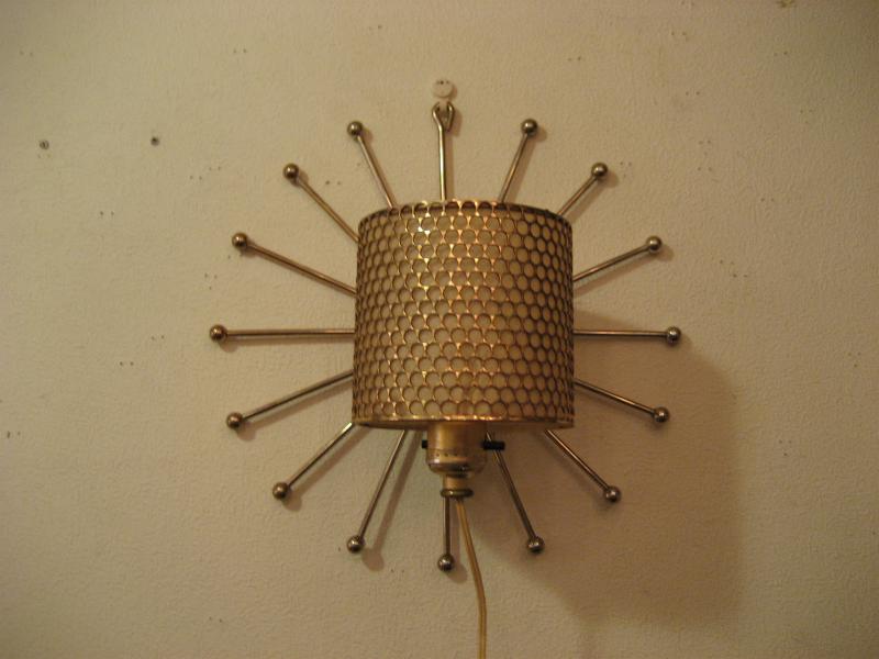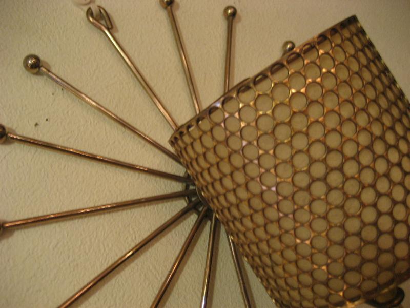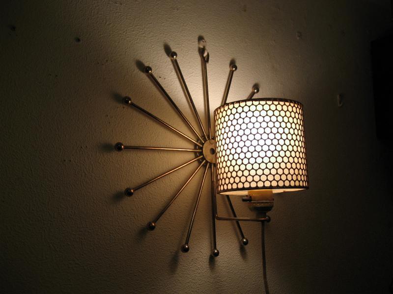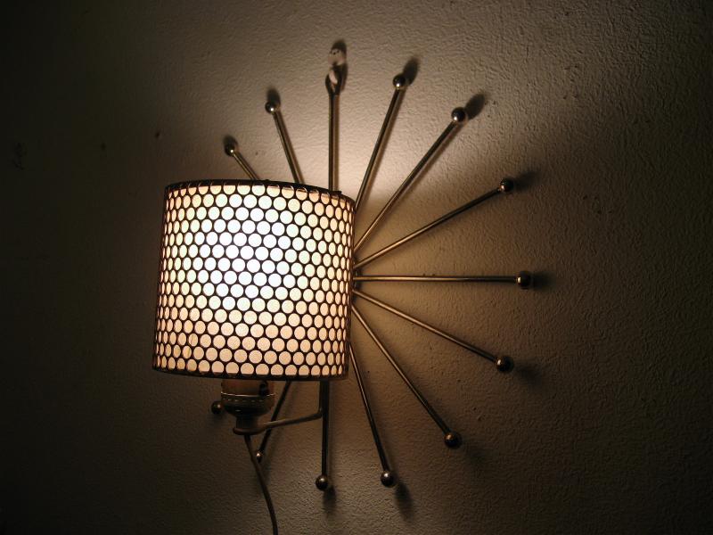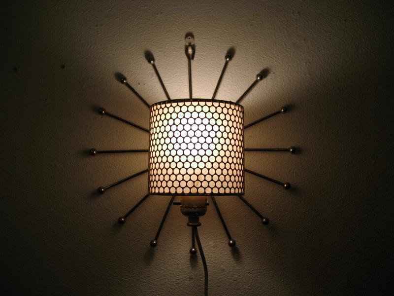 | アトミックビンテージスターバーストウォールランプ 50-60年代 USA. バックにスターバーストデコが付いたビンテージ壁掛けランプ。シェードはメッシュとファイバーグラスの2重構造タイプ。クールでGOODなアトミックライティングピース! 電源は家庭用コンセント対応コードで、スイッチはソケットに付いていてスライドタイプ。 |