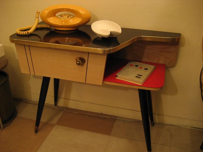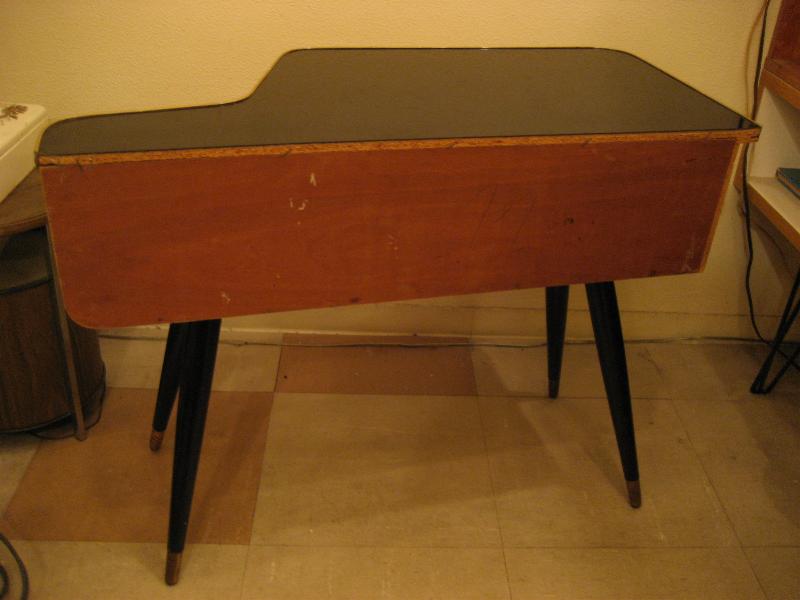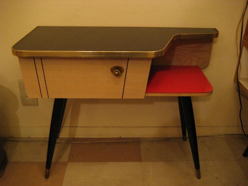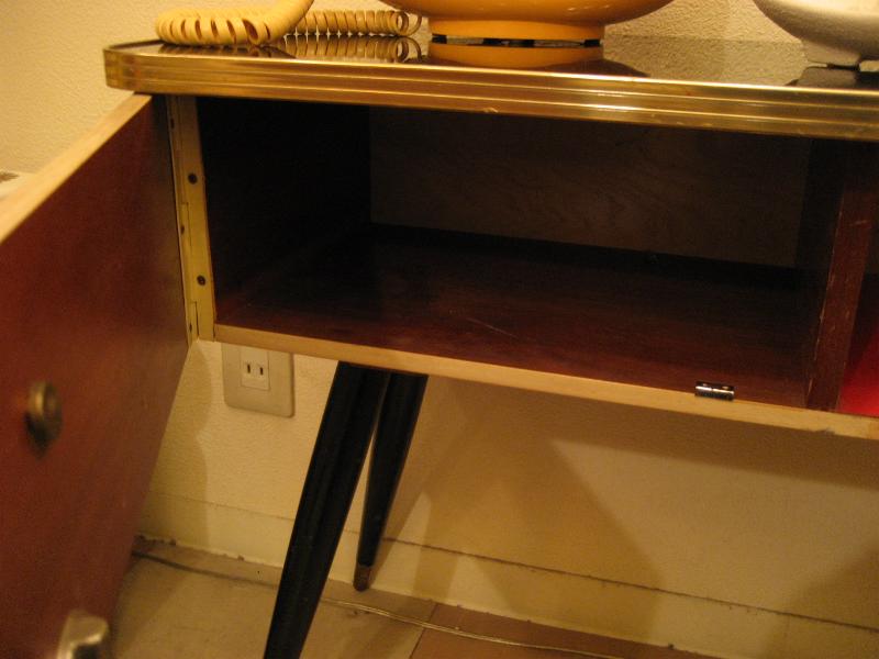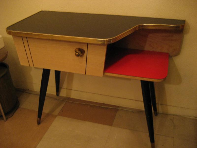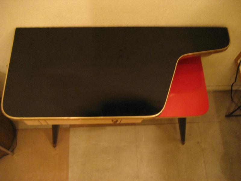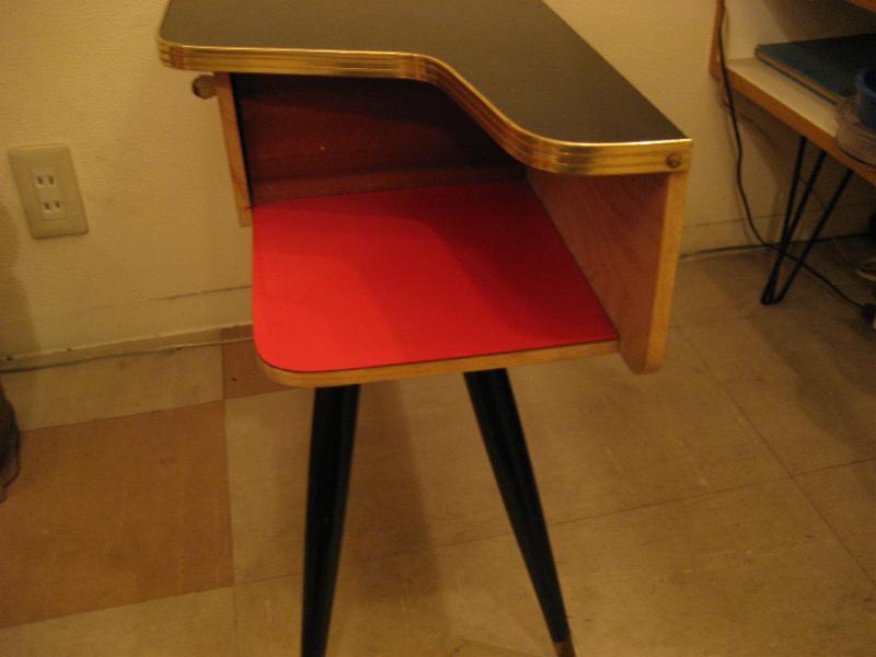 | アトミックビンテージテーブル / 50年代 USA ブラックとレッドの天板カラーがクールなビンテージテーブル。前面に開き扉付きで物入れになっています。扉の引き手(ツマミ)のデザインがクール!(写真参照) ブラック4本足タイプ。お部屋のコーナー、壁際、ソファやチェアサイド、テレビやパソコンなどの台にもGOODなクールビンテージフロアピース! |