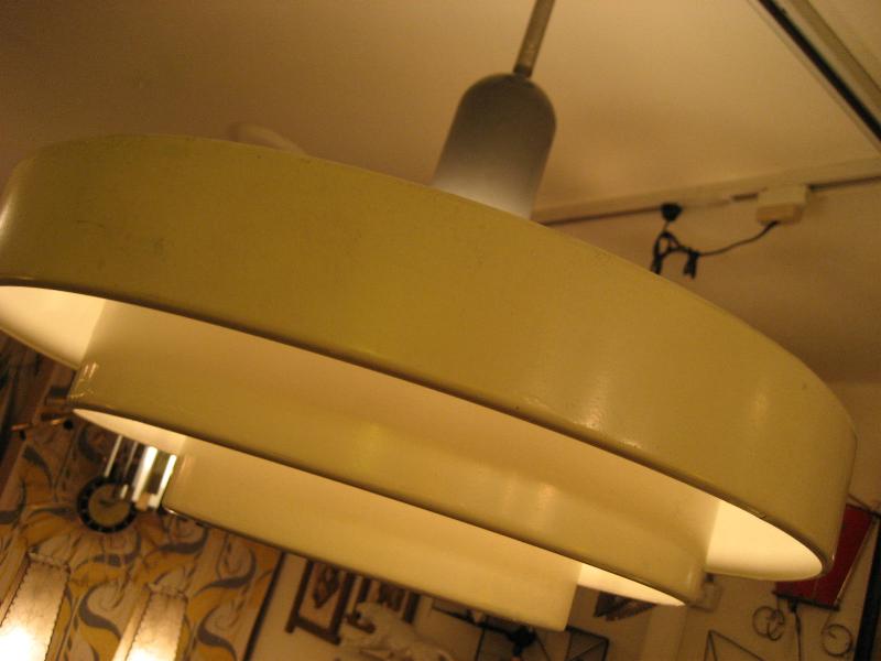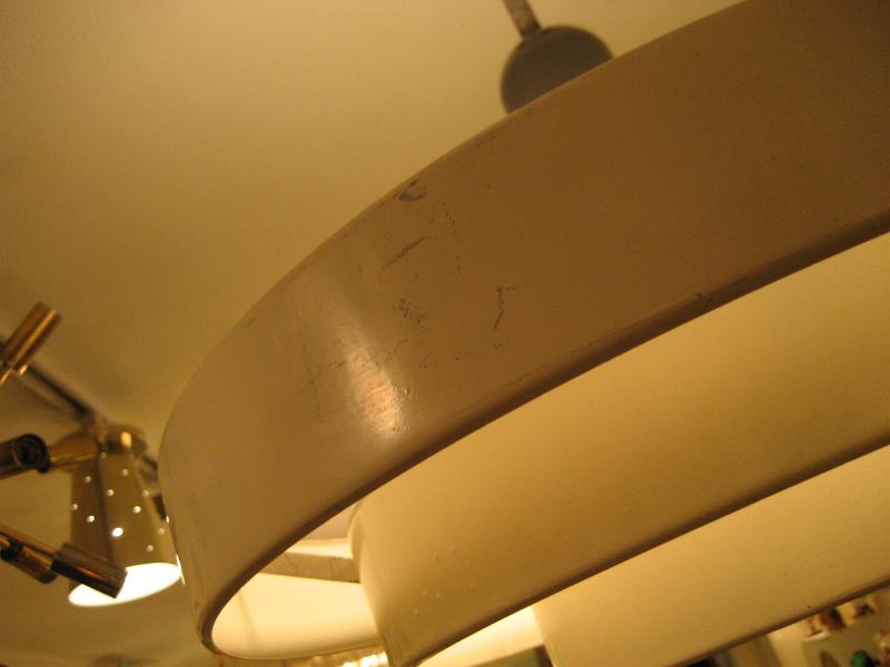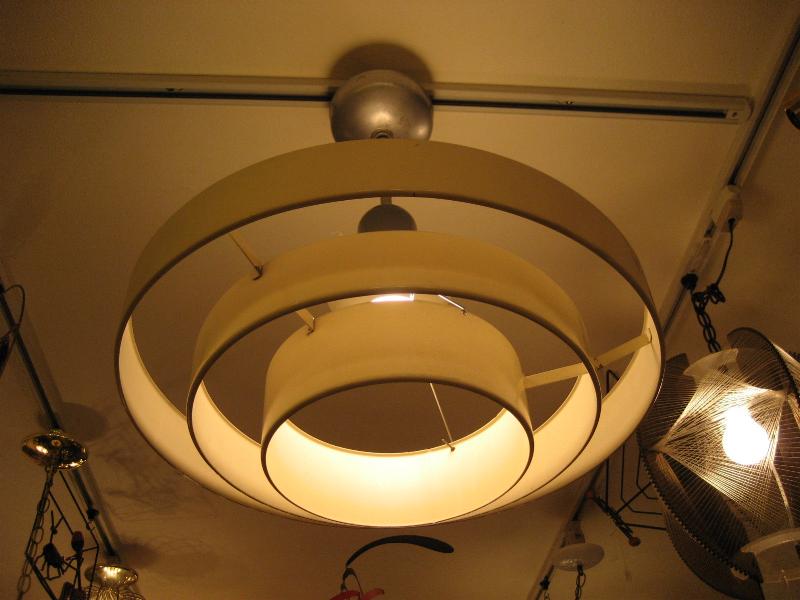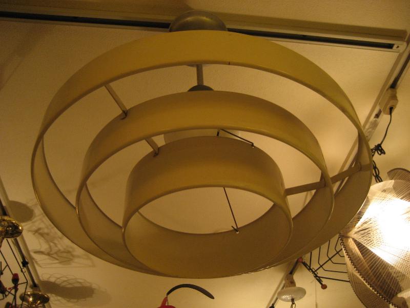 | ビンテージアトミックシーリングランプ 50年代 USA. 古いレストランなどで使用されていた3段ラウンドリングのフィンシェードタイプ、インダストリアルな雰囲気も持つマシンエイジなクールランプです。 クールでGOODなアトミックライティングピース! 電源は家庭用引っ掛けシーリングに交換済ですのでかんたん設置、すぐに使用できます。 |