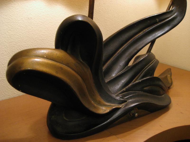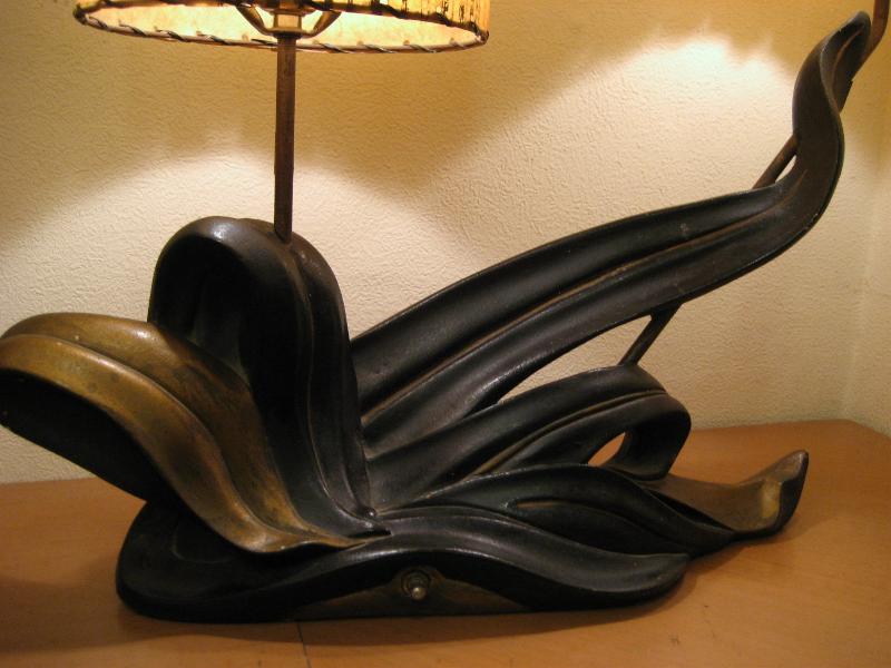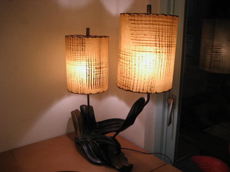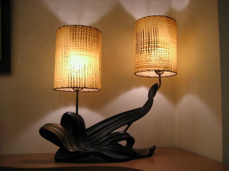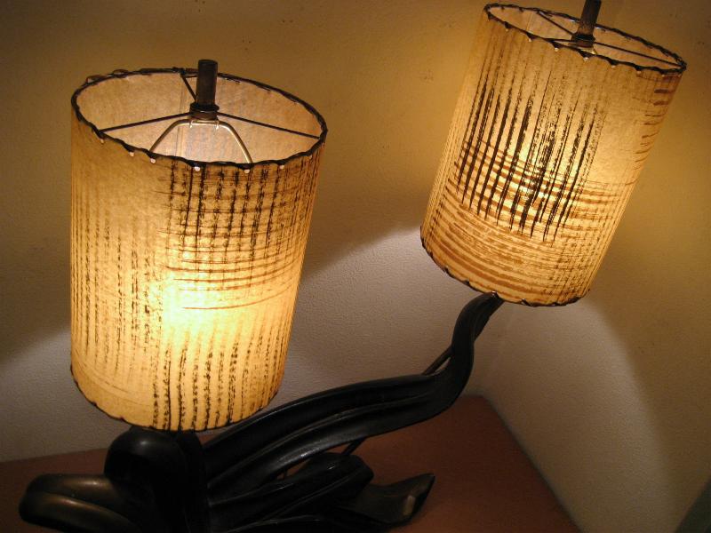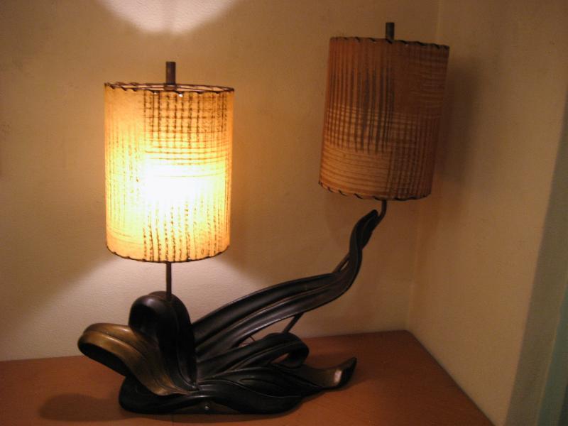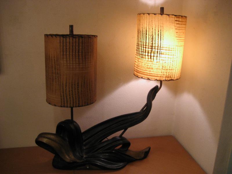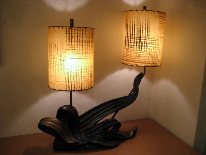 | アトミックビンテージシェードランプ / 50年代 ©PLASTO MFG, USA. ツインシェードのマジェスティックなクールビンテージランプ。シェードはファイバーグラスメイドで大柄のカスリ調。ベースはチョークメイドでクールな黒金カラーのアトミックシェイプ。スーパークールなビンテージライティングピース! 電源は家庭用コンセント対応コード、スイッチはベースに付いていてロータリー式3Wayタイプ。 |