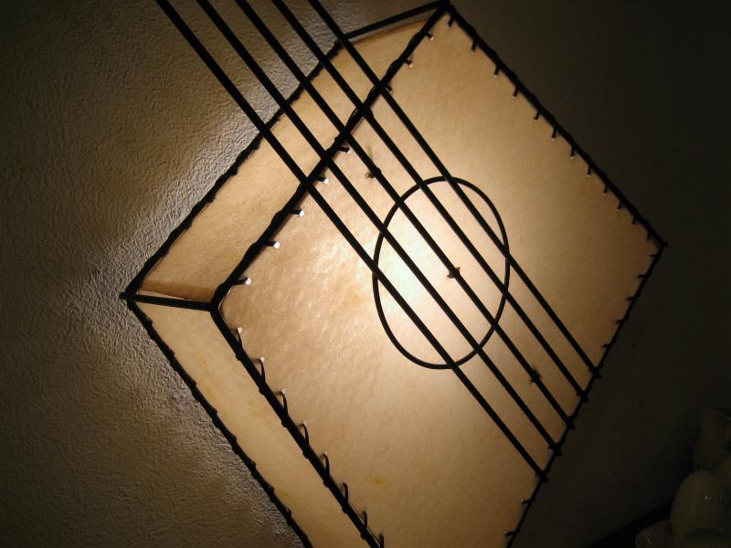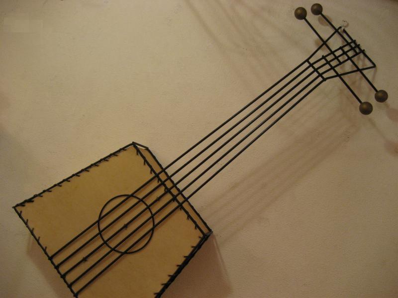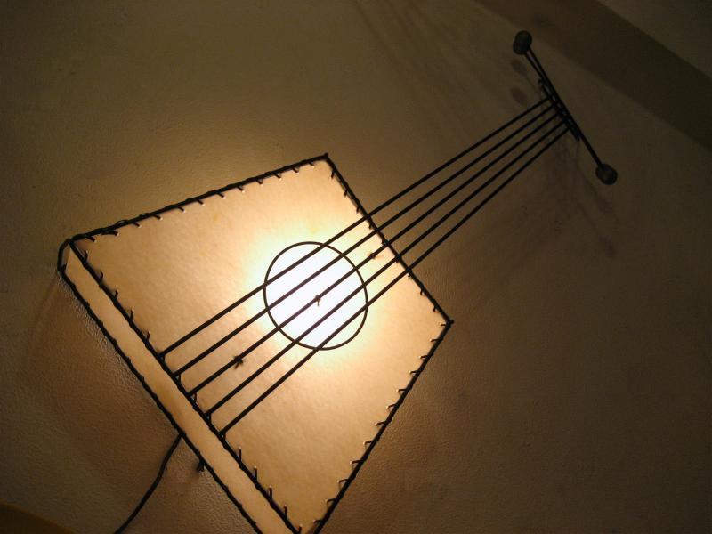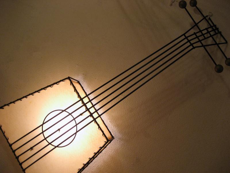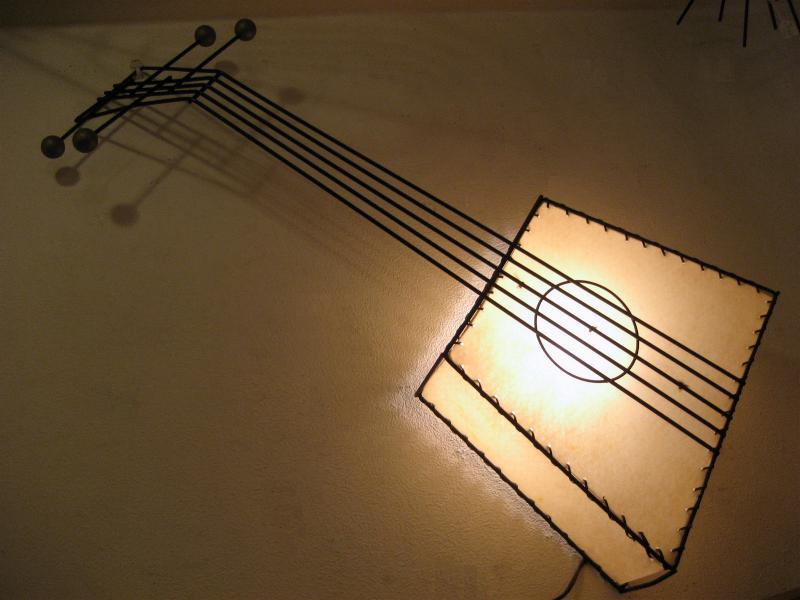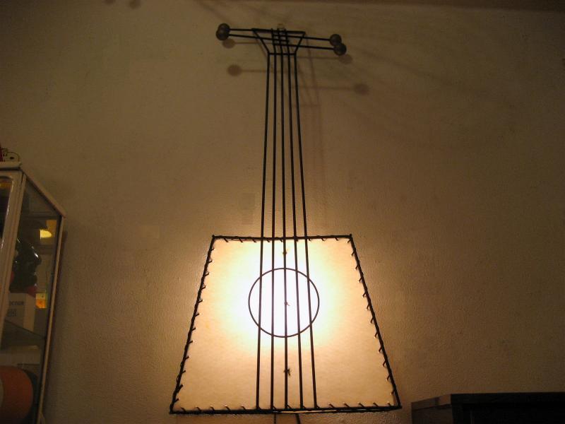 | ビンテージウォールシェードランプ / 50年代 ウェインバーグ, USA. スクエアギターシェイプの超レアなビンテージ壁掛けシェードランプ。ブラックアイアンフレームにシェードはファイバーグラス製。弦の調整ツマミにウッドボールデコレーション。スーパークールでモダンなビンテージライティングピース! 電源は家庭用コンセント対応です。スイッチはシェード内側ソケット部分に付いていてPULLタイプ。 |