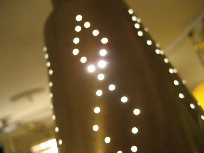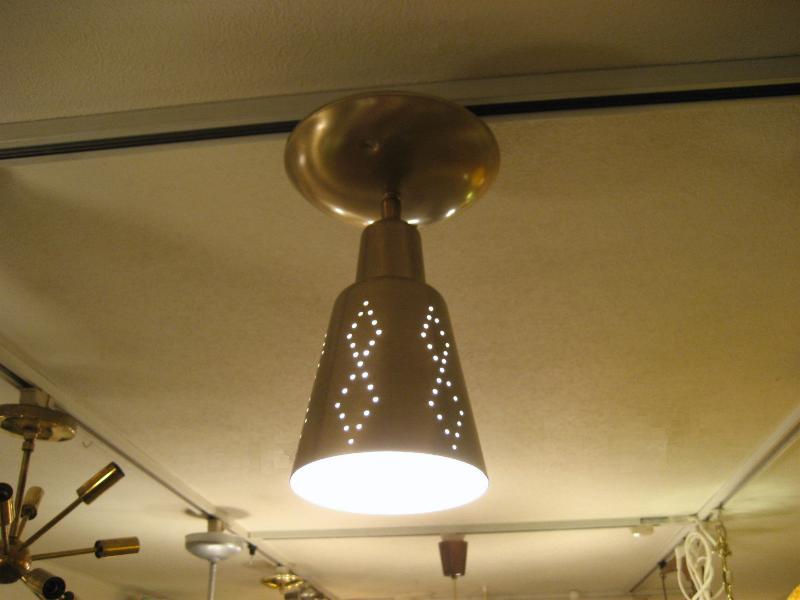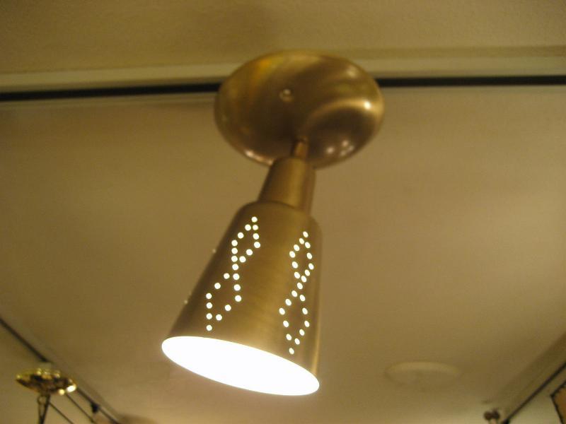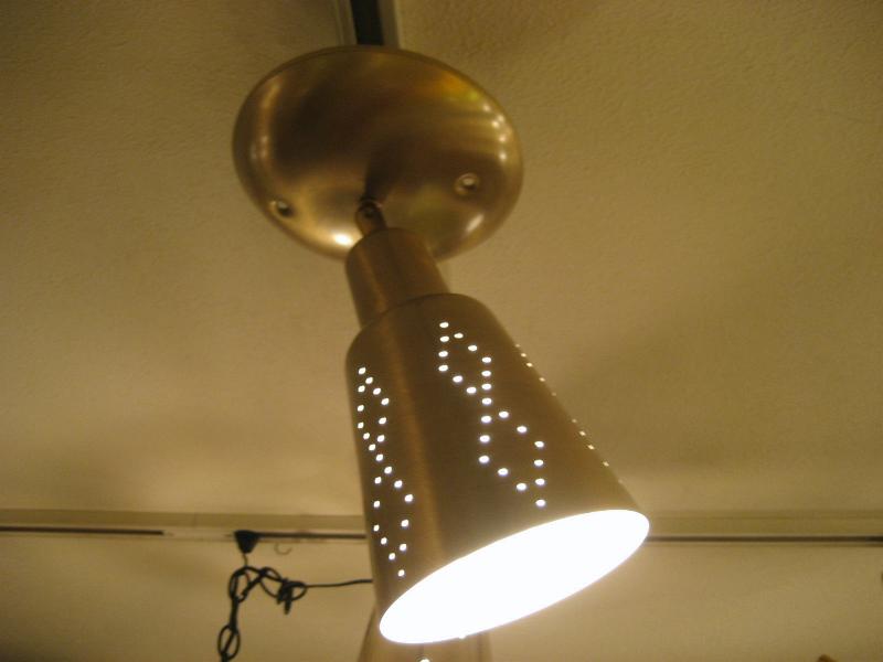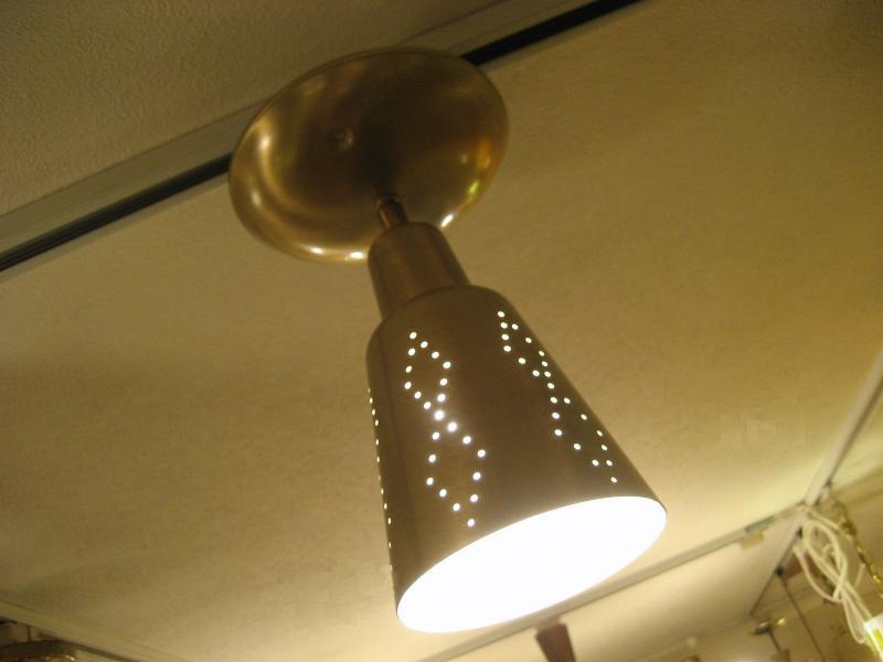 | アトミックシーリングスポットランプ / 50-60年代 USA. 天井シーリングのスポットランプです。シェード付け根部分(ネック)が可動しますのでいろいろな方向にセッティング可(写真参照)。シェード側面のダイヤデザインホールからもれる明かりがクールでGOODなビンテージライティングピース! スプートニクともマッチングしますし、玄関やセカンド照明としても最高です。電源は引っ掛けシーリングに交換済みですのですぐに設置可能です。 |