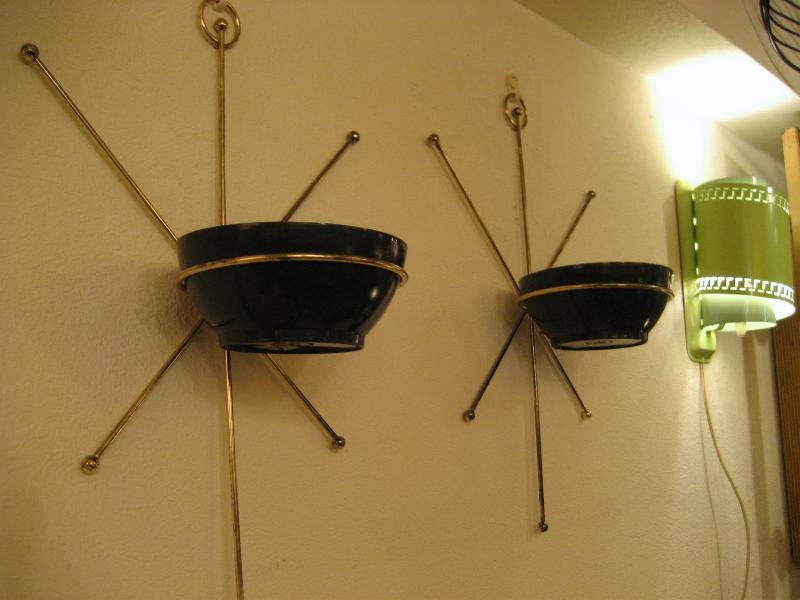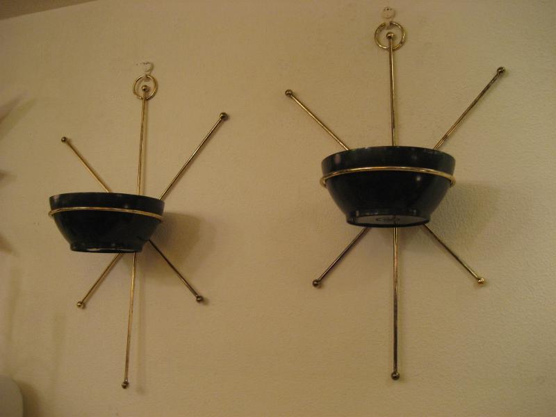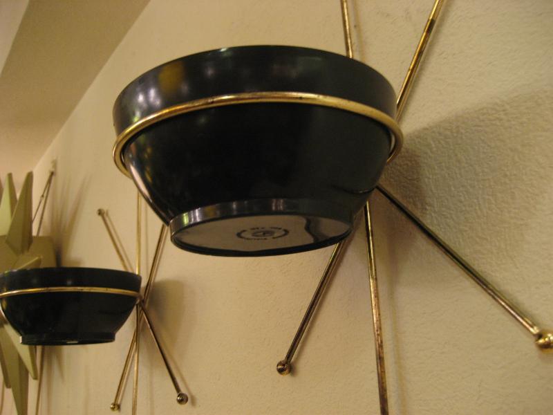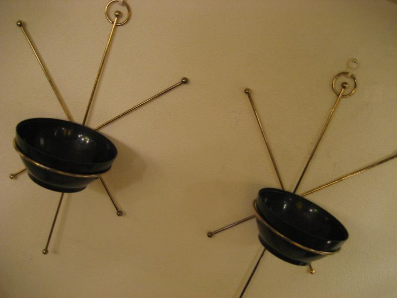| ペアアトミックスターバーストウォールプランター / 50年代 USA ペアの壁掛けタイプスプートニクプランター。ゴールドブラススターバーストフレームにプラスチックメイドのハーフボールシェイプのブラックポット。ディスプレイ性が高く、クールでGOODなアトミックウォールデコピース! |
