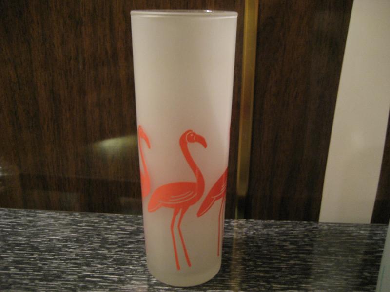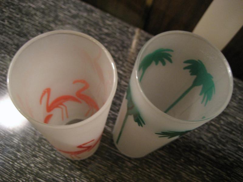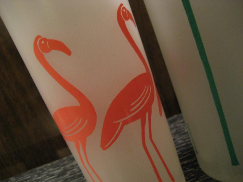 | ビンテージフラミンゴ&パームツリーグラスセット / 50-60年代 USA. グラス2個セット。それぞれフラミンゴとパームツリーのプリントがされていて、グラスはフロステッドタイプ。アメリカでは通称レモネードグラスなんて言われることが多いようですが何でもOK! フラワーベースなんかにもGOOD。。。 クールでキュートなビンテージテーブルピース! |
