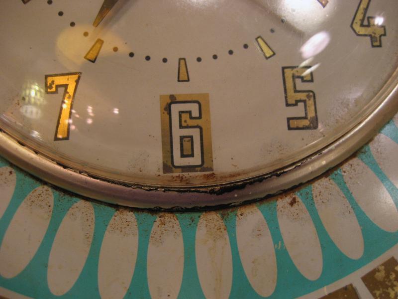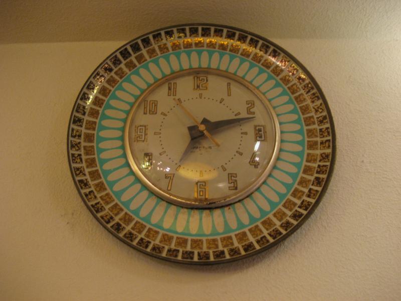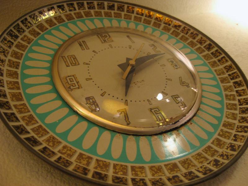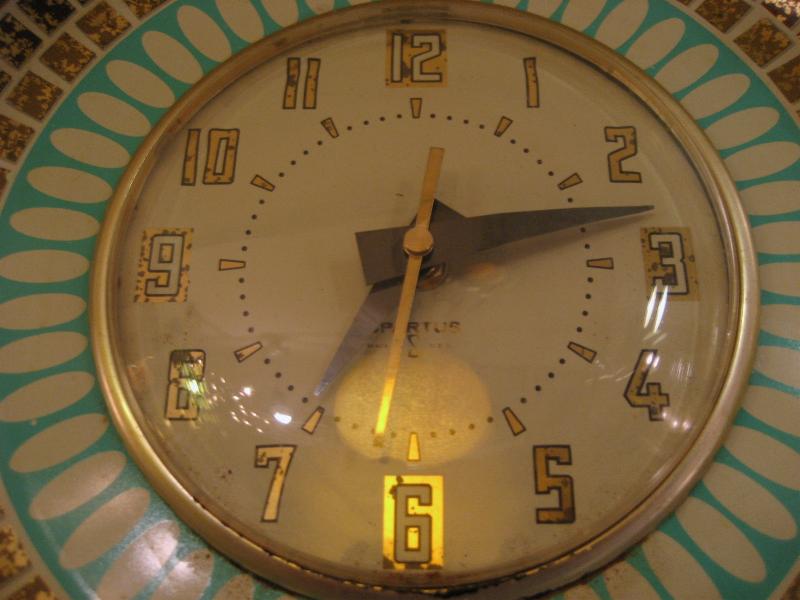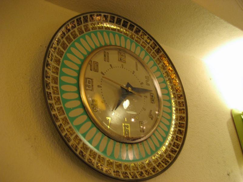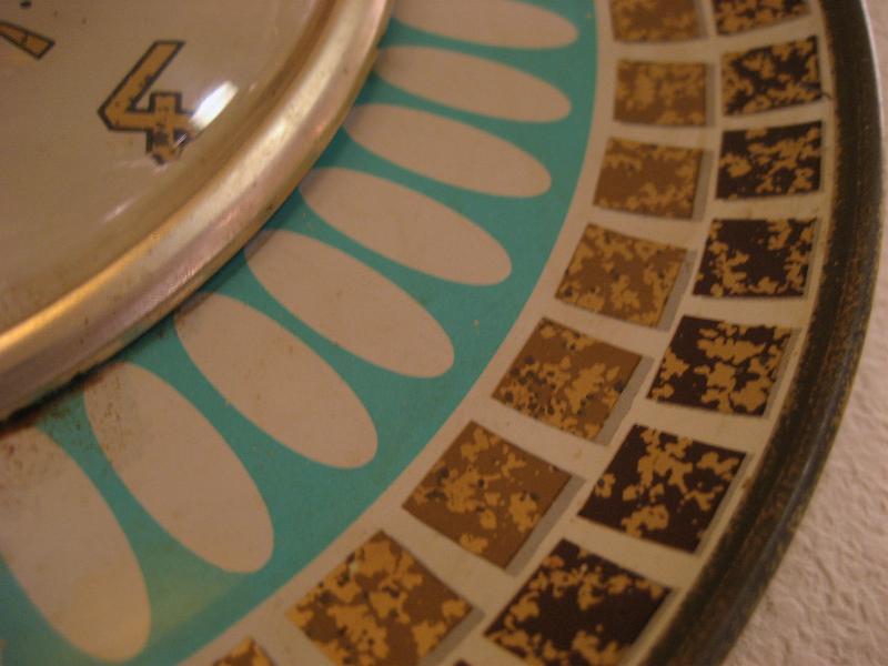 | ビンテージウォールクロック / 50-60年代 SPARTUS, MADE IN USA. タイルモザイクプリントのビンテージ壁掛け時計。メタルフレームにプリント、センター文字盤部分はドームタイプのアトミックシェイプカバーでブラック長短針にゴールド秒針。クールでキュートなGOODビンテージタイムピース! ムーブメントはバッテリータイプ(単3x1個使用)に交換済みでですので時間は正確です。 |