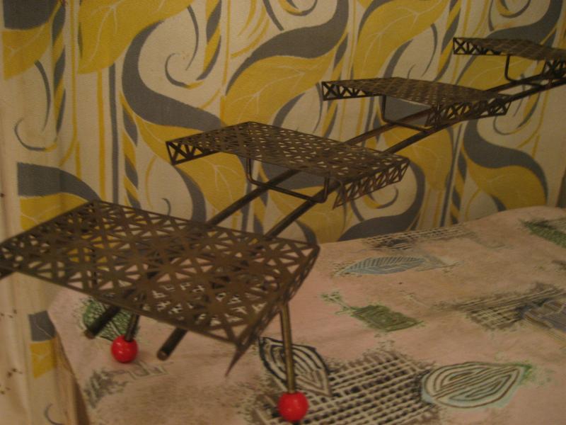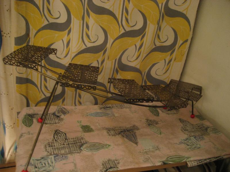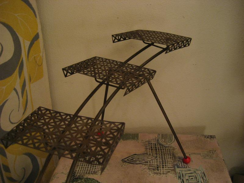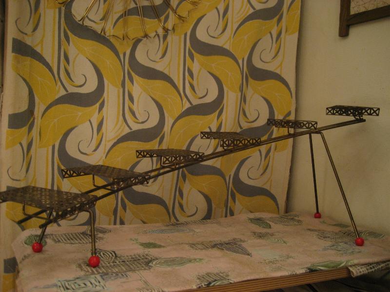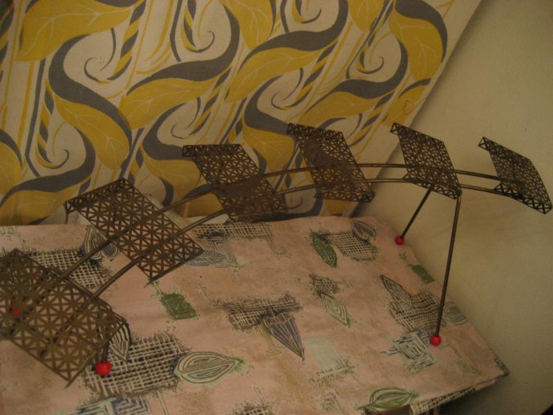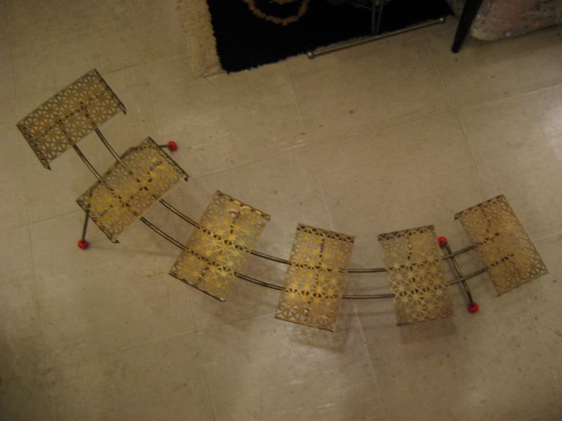 | アトミックブーメランシェルフ / 50-60年代 USA. 珍しい段違い6個のメッシュシェルフがついたブーメランシェイプのアイアンシェルフ。4本足タイプでカラーボールデコ。プランターシェルフやお部屋のコーナー、サイドボードアップなどさまざまな用途に。。。幅広いディスプレイが楽しめるビンテージアトミックピース! |