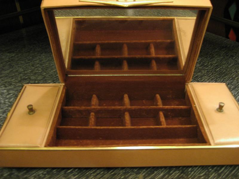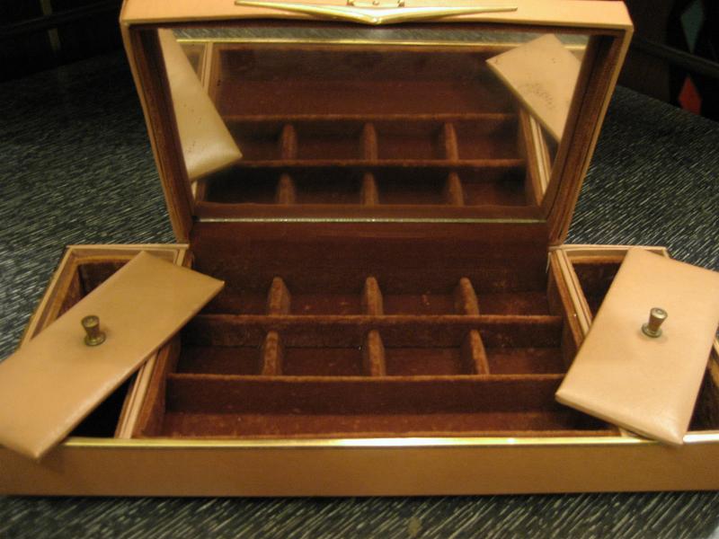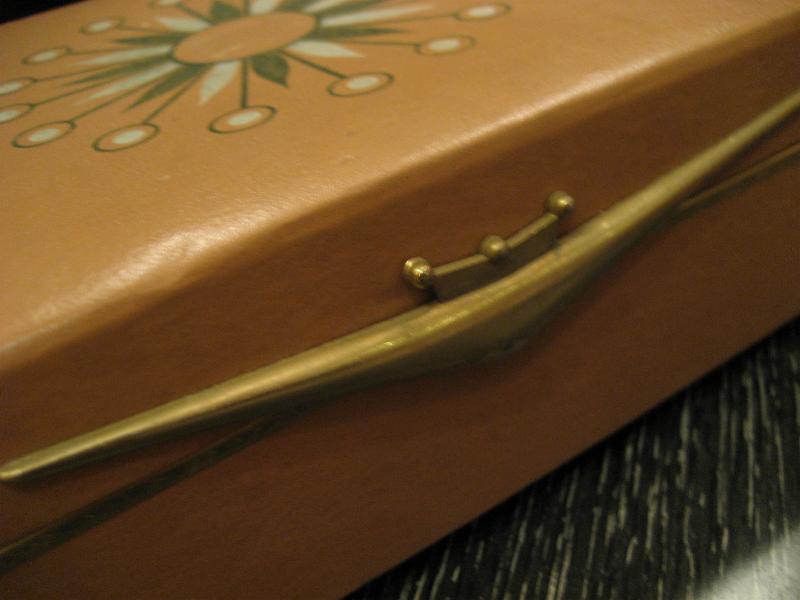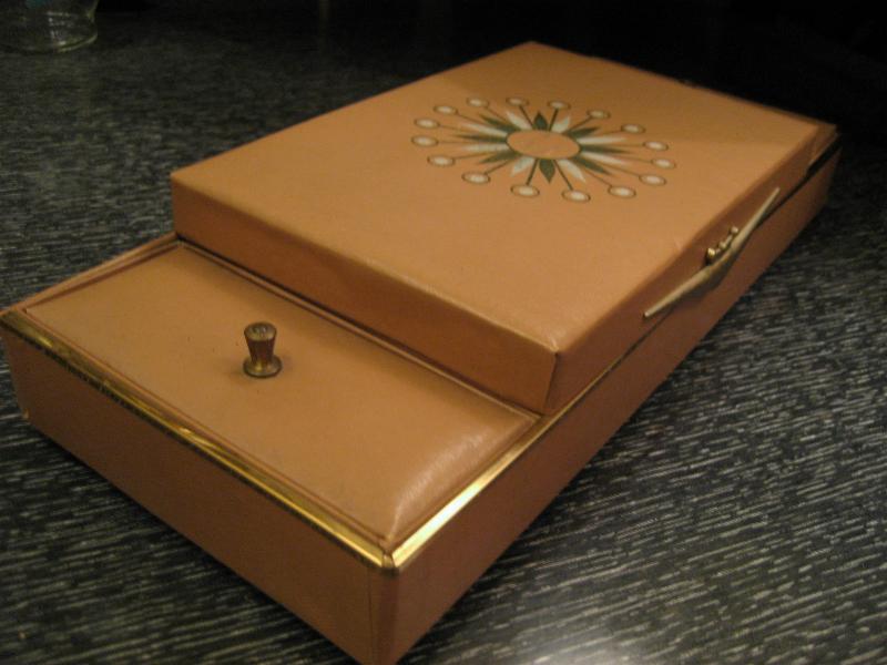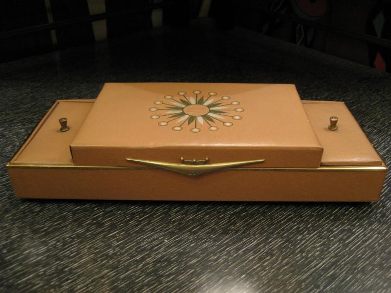 | ビンテージアトミックドレスアップボックス / 50年代 USA. ビニルレザーフェイスのクールアクセサリージュエリーボックス。センターボックスにスターバーストデコプリント。インサイドはミラー付きでトレイは小物用の仕切り付き。両サイドはカバー付きボックスになっていますので、ドレスアップだけではなく幅広い用途のクールでGOODなビンテージバニティピース! |