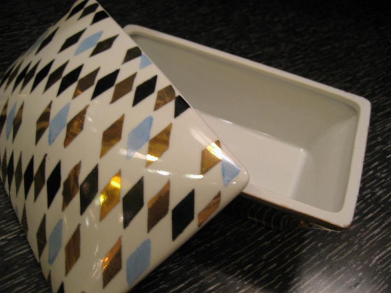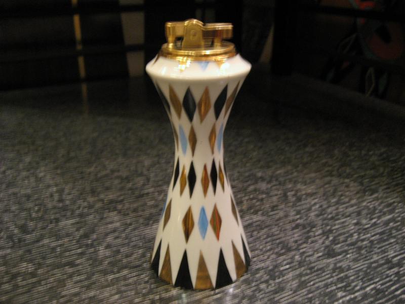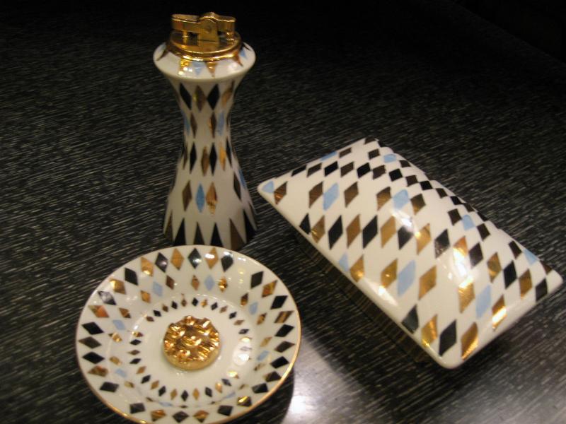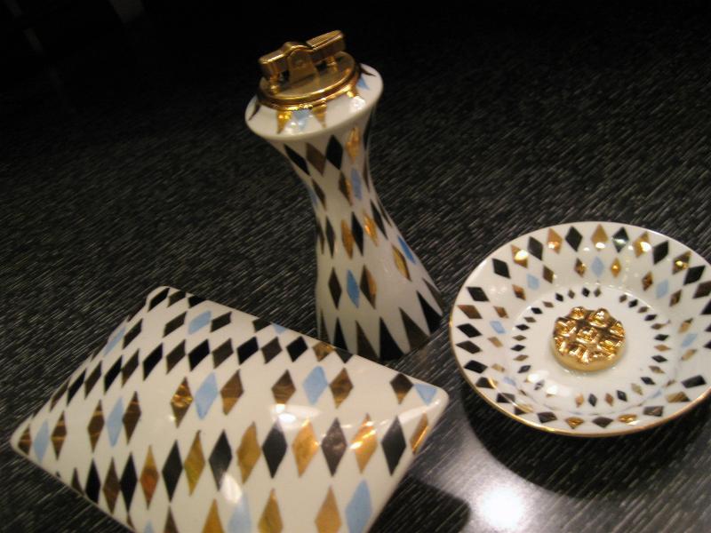 | アトミックスモーキングテーブルセット / 50年代 USA. ブラック・ゴールド・ミントブルー3色のダイヤ柄がクールなライター、灰皿、シガレットボックスの3点セット。クールでGOODなスーパーアトミックテーブルピース。ディスプレイにもGOOD! |