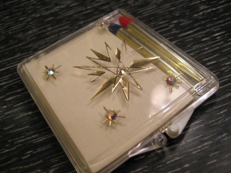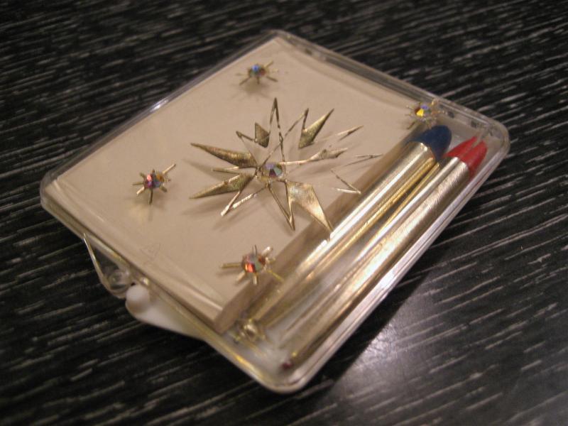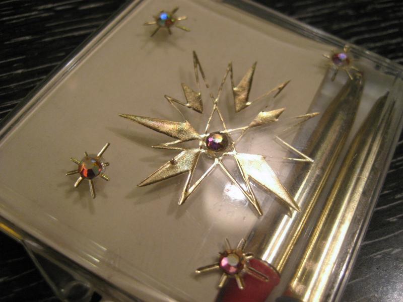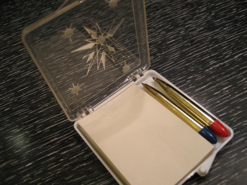 | ビンテージペン&メモケース / 50年代 USA. クリアケースにゴールドスターバーストとラインストーンアクセントがクールなアトミックペンケース。1枚ずつはがせるメモペーパーとレッドとブルーインクのショートペンが2本入っています。ペンはもちろん使用可能です(中身を交換しています)。 おそらく何かのノベルティ的なアイテムだったと思われ、無地の白いボックスに入っています。 スマートシェイプですからポケットやバッグ、パースなどに。。。珍しいレアアイテムですので携帯用にもこだわりを!!! |