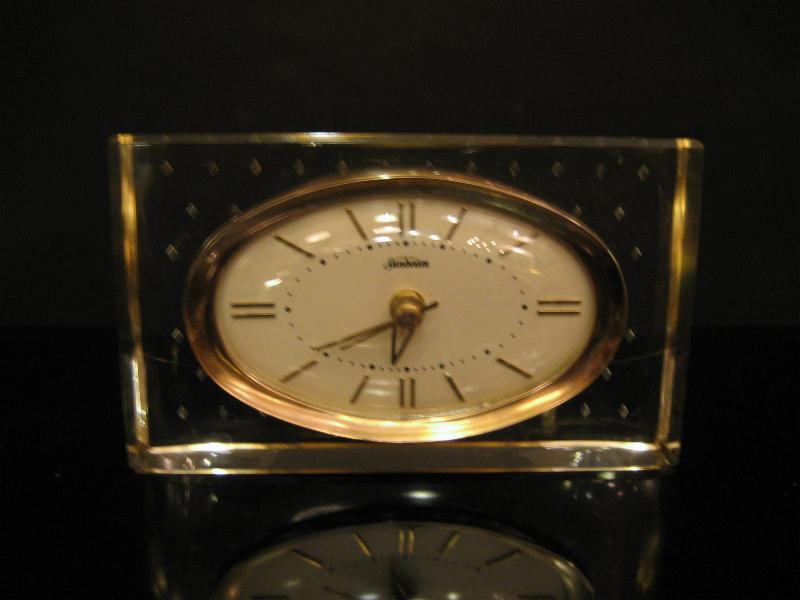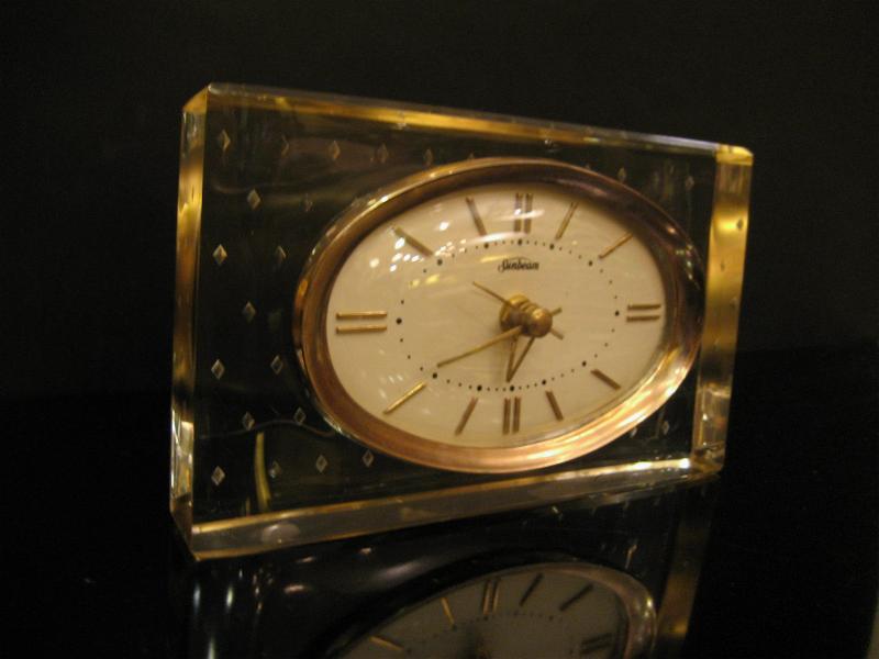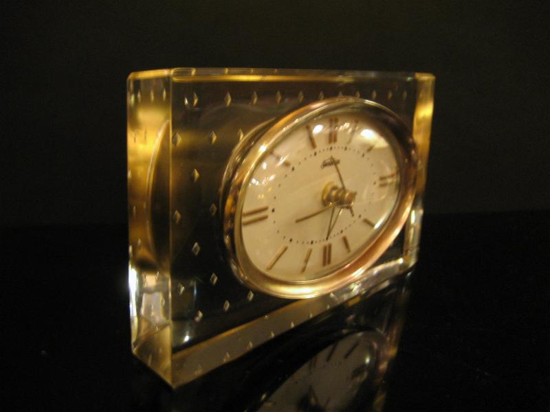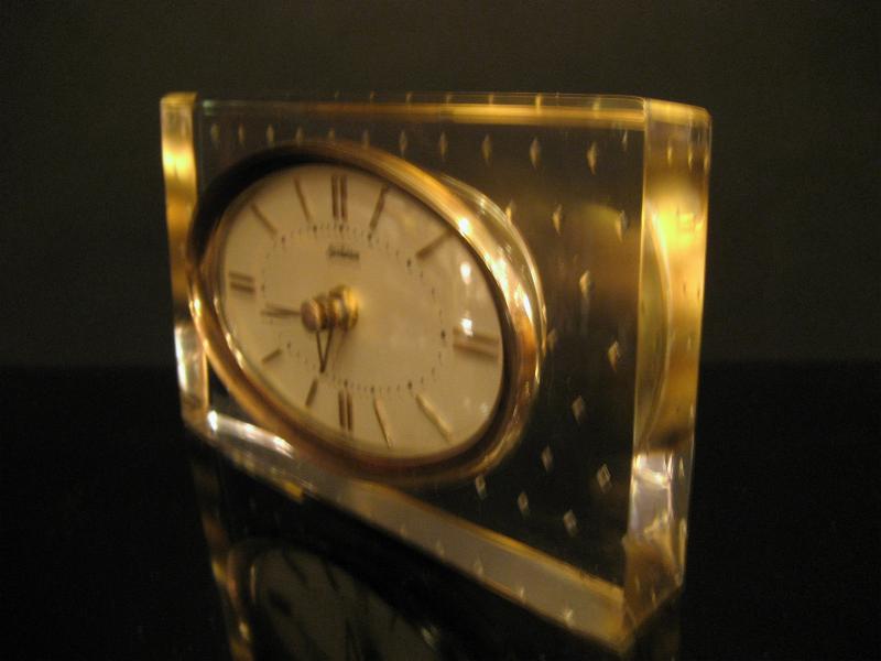 IN USA. クールなルーサイトベースの置時計。クリアボディにゴールドムーブメントケース、文字盤はオフホワイトでゴールドダイヤル&ゴールドハンド。背面にダイヤシェイプの小紋調デザインが掘り込んであります。クールでGOODなビンテージタイムピース! ムーブメントはバッテリータイプ(単3x1個使用)に交換済みでですので時間は正確です。 |