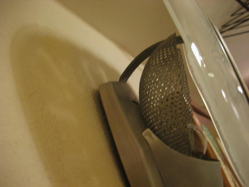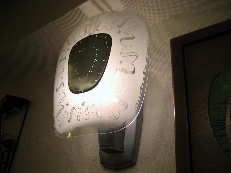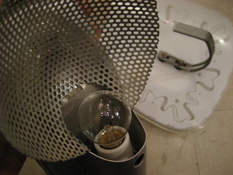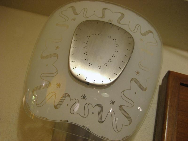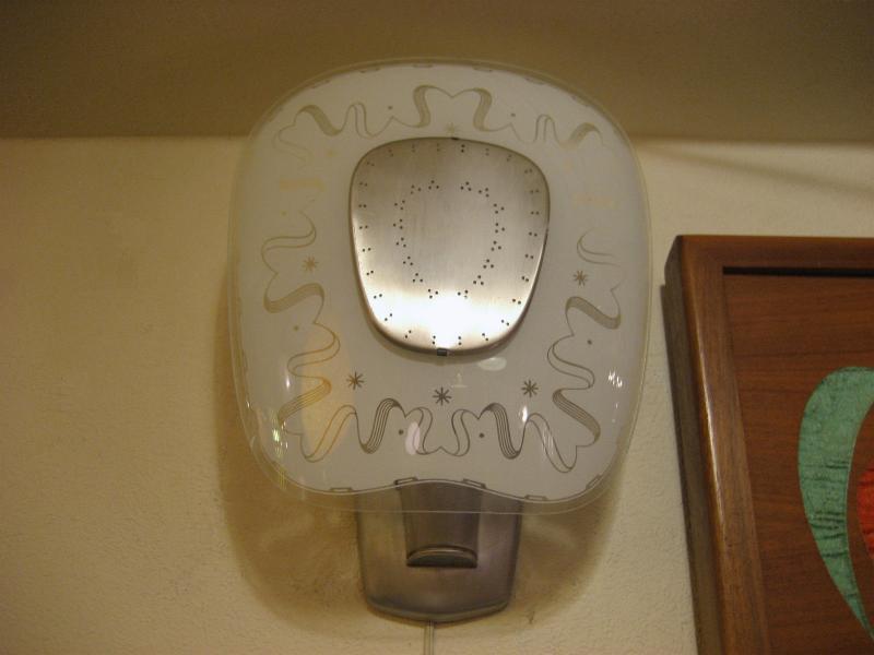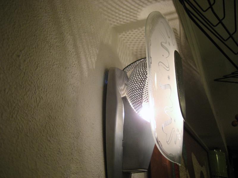 | アトミックビンテージウォールランプ 50年代 USA. スターバースト&アトミックプリントのガラスシェードがクールなビンテージ壁掛けランプ。マウントベースはアルミキャスト素材でランプソケットにメッシュカバー付。シェードのセンターにも同素材のパンチングパネルが付いています。クールでGOODなアトミックライティングピース! 電源は家庭用コンセント対応コードでスイッチはコード中間に付いています。ランプソケットは交換済み(ソケット不良だったため)。 |