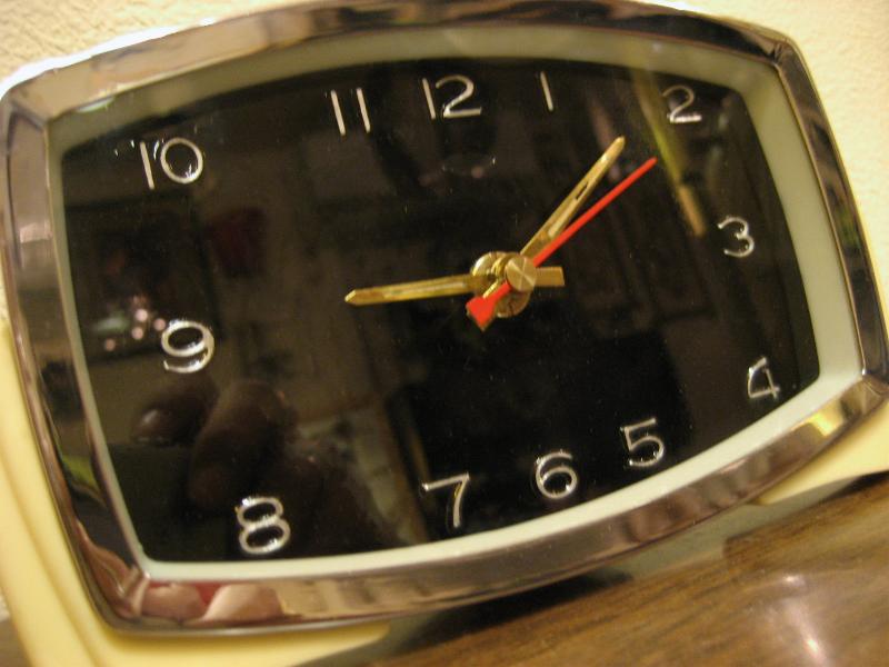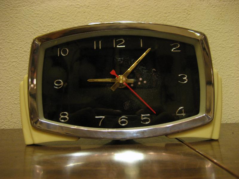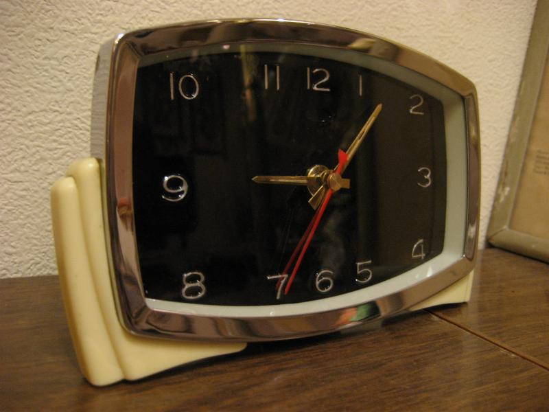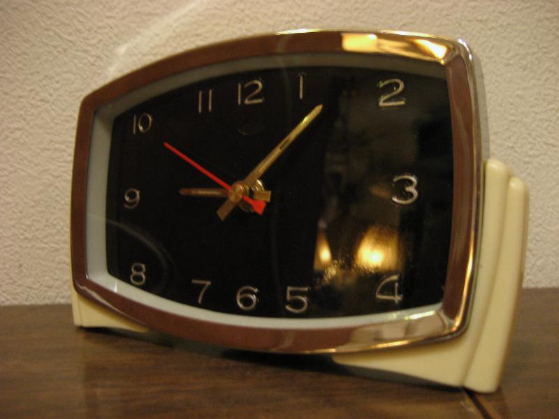 | ビンテージシェルフクロック / 50年代 USA. 両サイドのフレームが独特のクール置時計。黒文字盤に赤い秒針がGOODなビンテージタイムピース! ムーブメントはバッテリータイプ(単3x1個使用)に交換済みでですので時間は正確です。 |