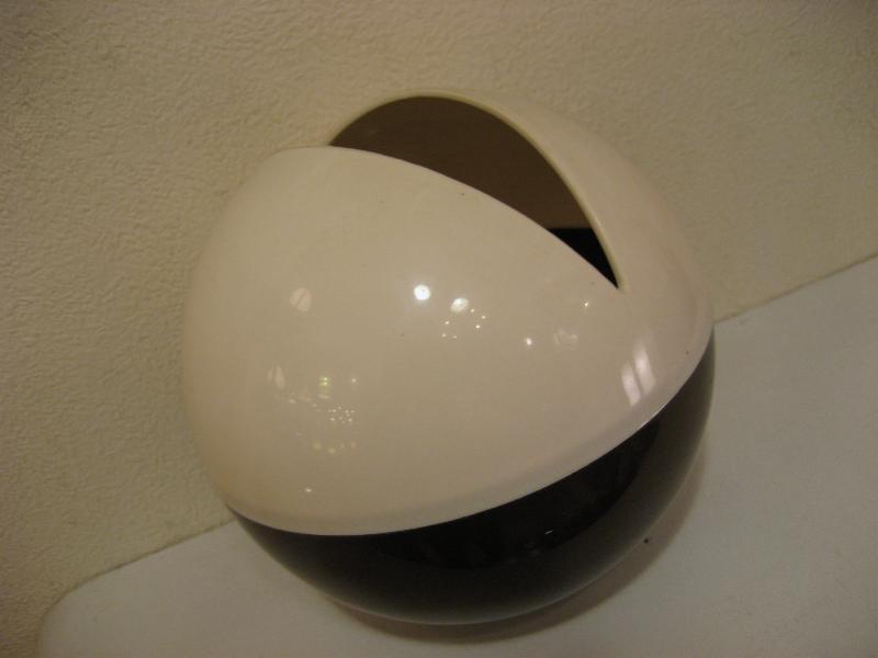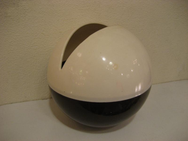 USA. ボールシェイプのビンテージティッシュボックス。ツートーンカラーでモダンなデザイン。底面内に錘が入っているので転がることはありません。アトミックシェイプな取り出し口がクールでキュートなビンテージバニティピース! ■ティッシュのセットについて 市販されているティッシュのボックスから中身を取り出し2つに折り曲げケースに入れます(写真参照)。 上部カバーをはめて1枚目を引き出し抜き取ると2枚目が引き出されますので通常どおり使用できます。 |