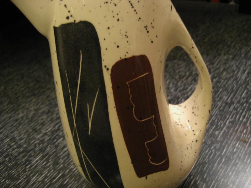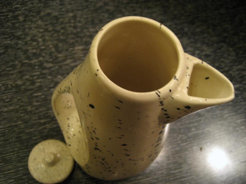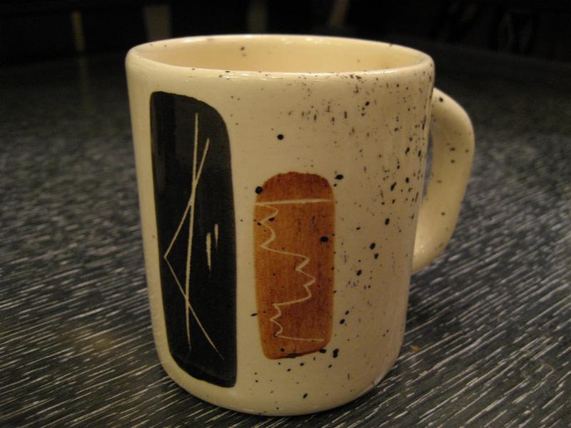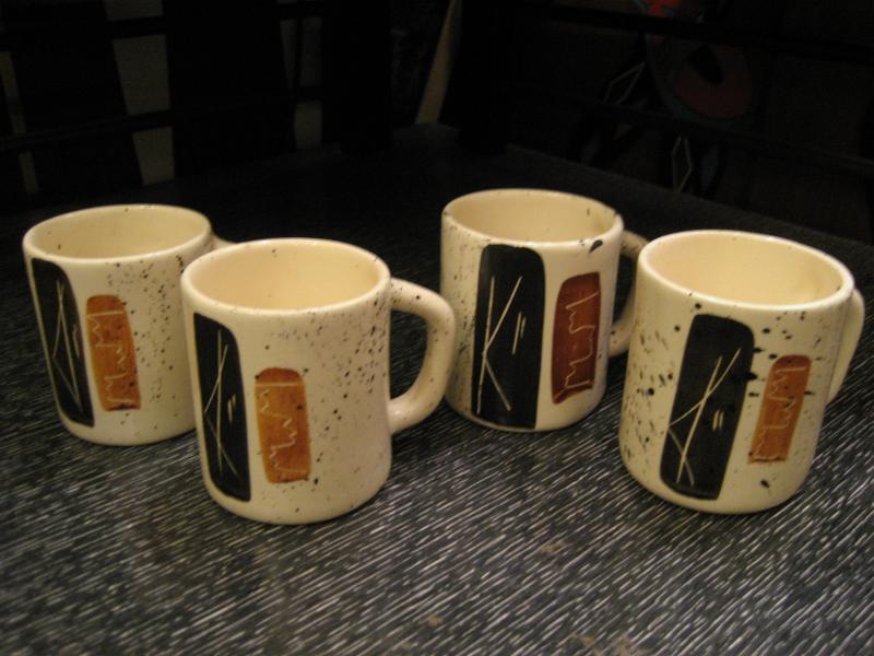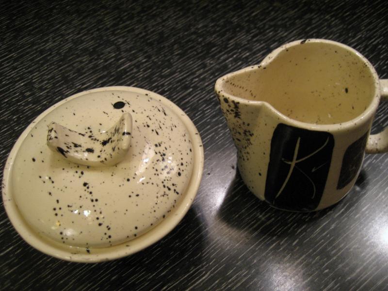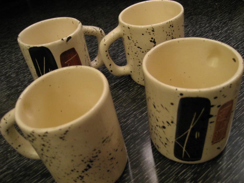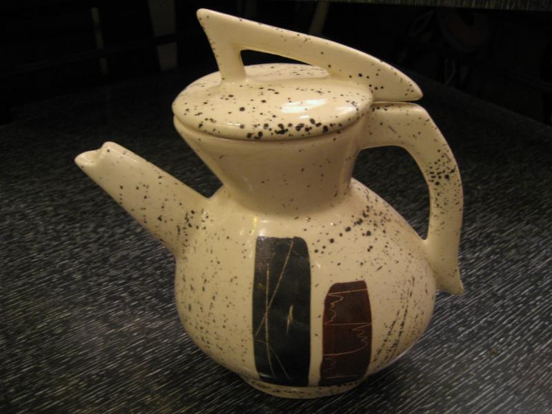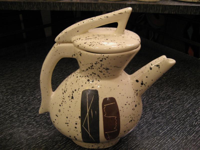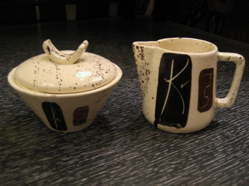 | ミッドセンチュリーアトミックモダンティータイムセット / 50-60年代 USA. アトミックでモダンなビンテージテーブルウェアセット。それぞれブラックとブラウンのモダン絵柄。シンプルなデザインのマグカップ4個、使いやすそうなクリームとシュガーポット、アトミックで今にないデザインのティーまたはコーヒーポットが2種類・・・計8点セット。おそらくカリフォルニア陶器だと思われます。。。 ティータイムを楽しくそして素敵に演出してくれるモダンでGOODなビンテージテーブルウェア! |