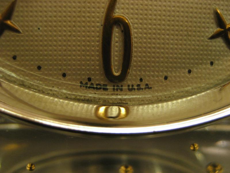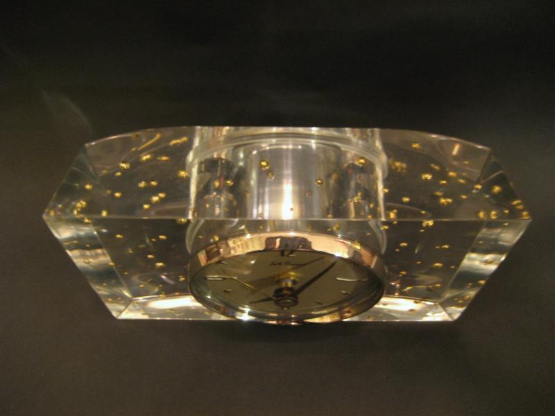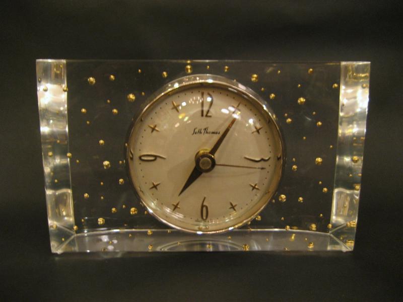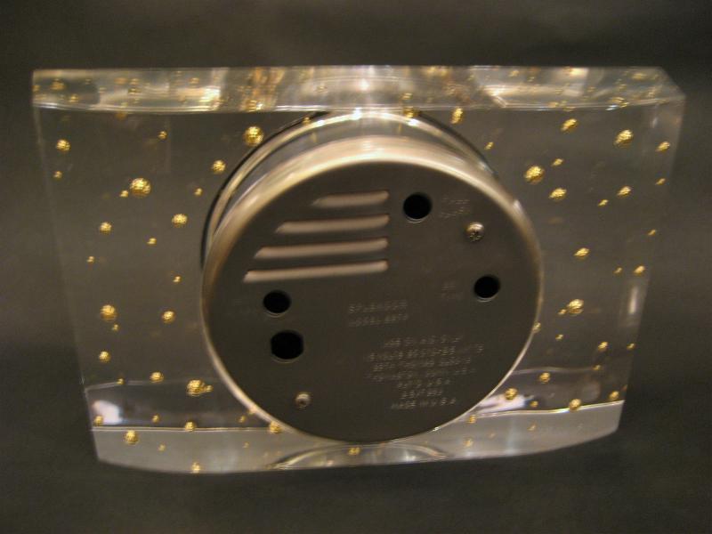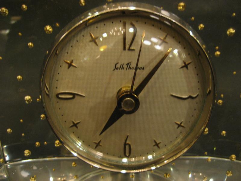 IN USA. ルーサイトベースにゴールドボールが気泡ように封入された置時計。クリアボディに文字盤はオフホワイトでゴールドスターバーストダイヤル&ゴールドハンド。クールでGOODなビンテージタイムピース! ムーブメントはバッテリータイプ(単3x1個使用)に交換済みでですので時間は正確です。 |