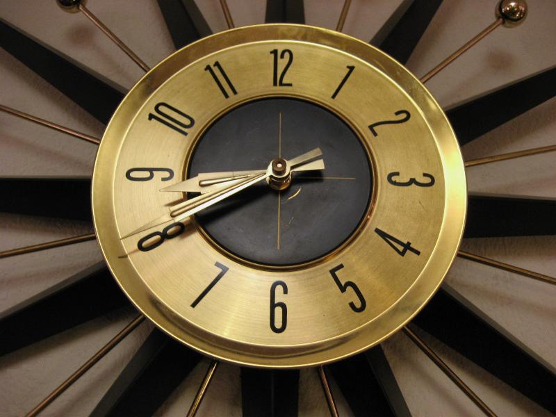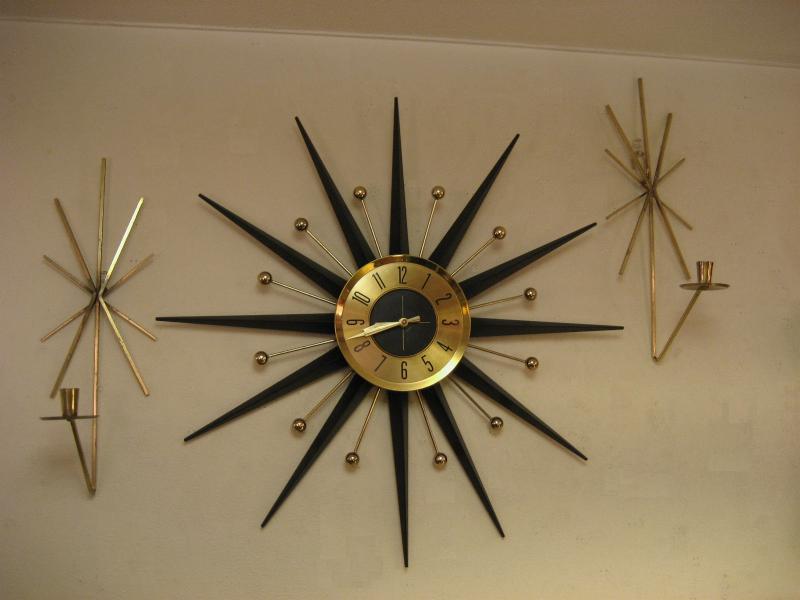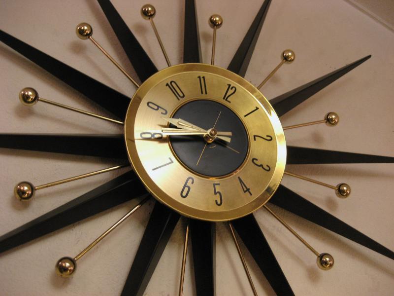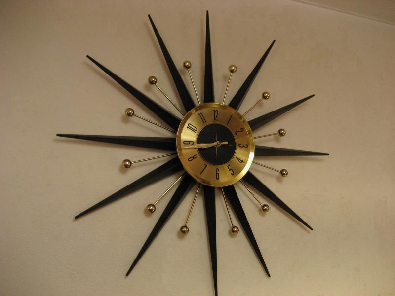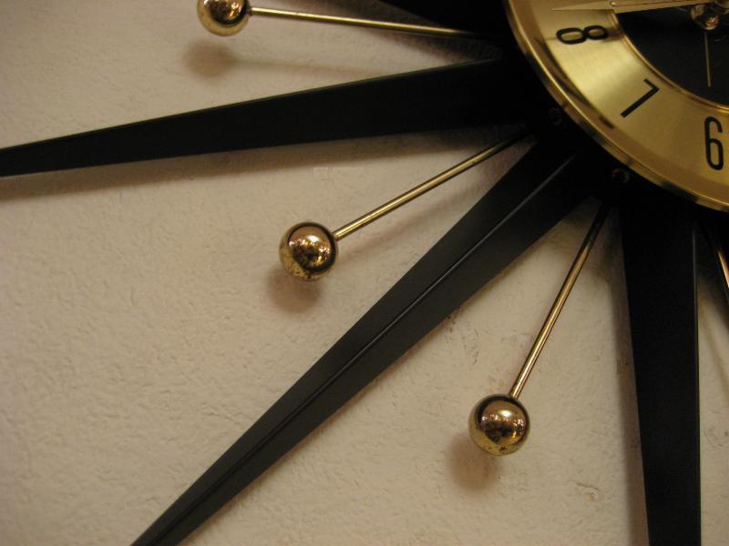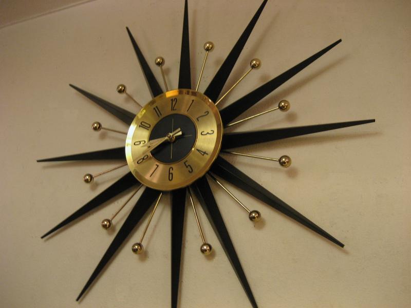 | ビンテージスターバースト/サンバーストウォールクロック / 50年代 USA. ブラック&ゴールドフェイスにブラックスタースポークとゴールドスプートニクデコスポークのコンビフレーム、ブラックインデックス&ゴールドハンドのアトミックスターバースト壁掛け時計。クールでGOODなビンテージタイムピース! ムーブメントはバッテリータイプ(単3x1個使用)に交換済みでですので時間は正確です。 |