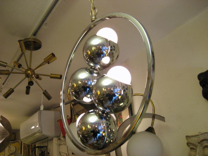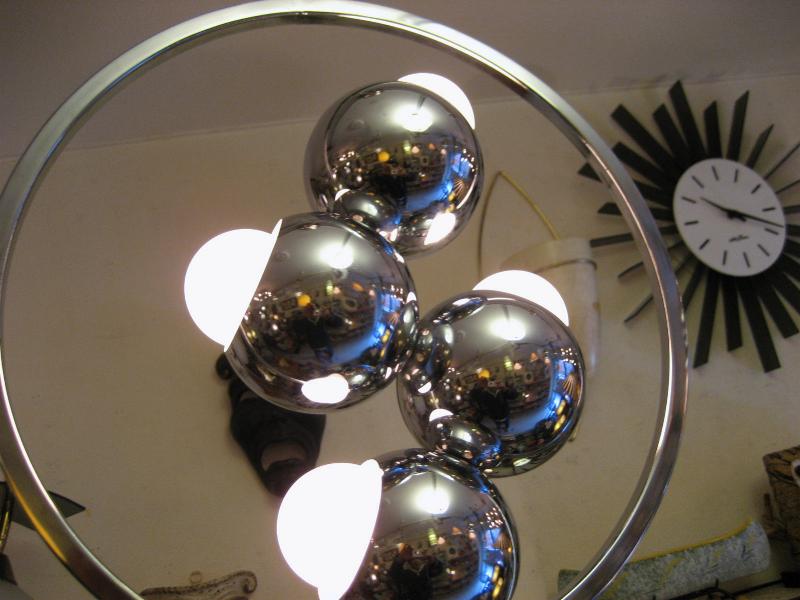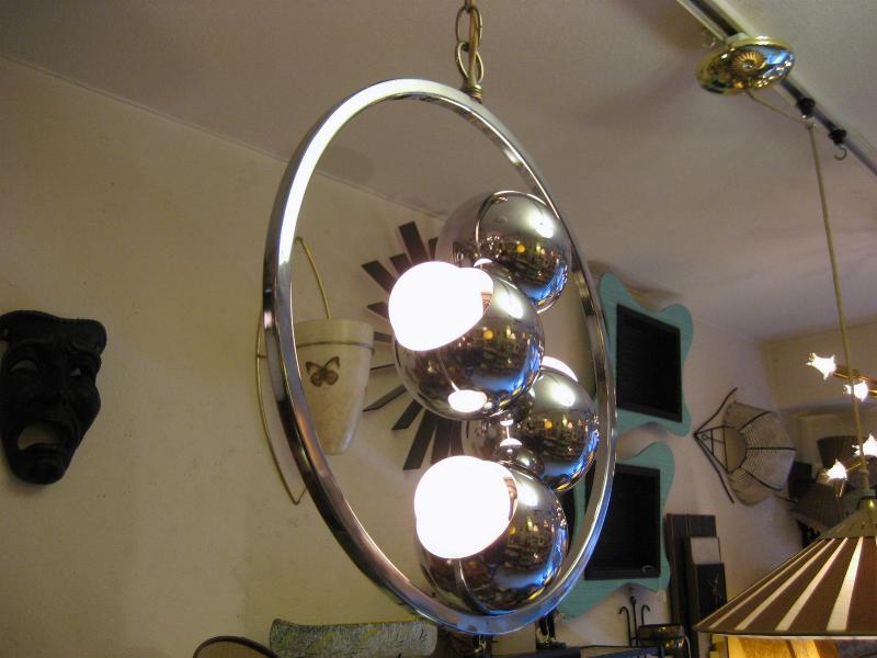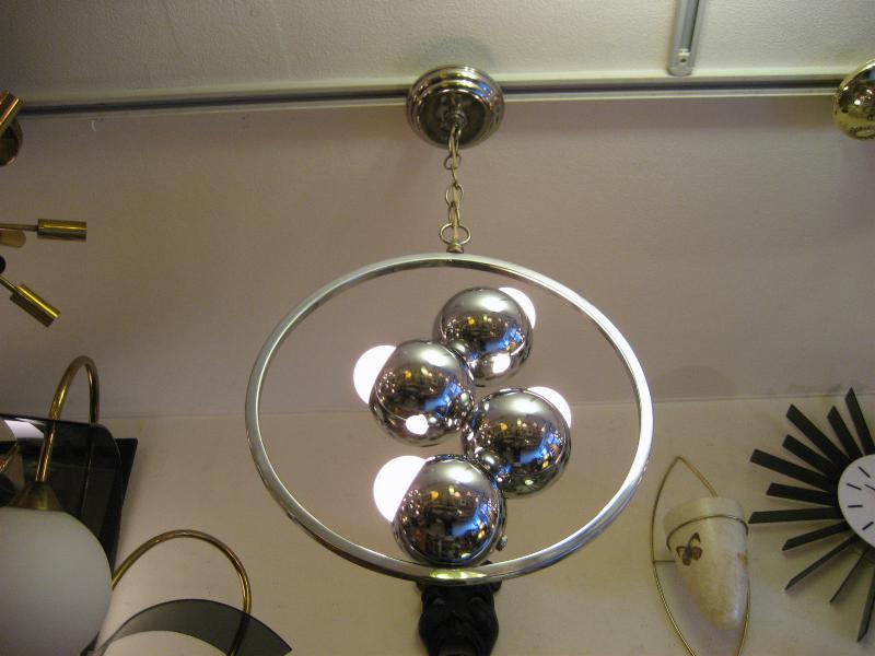 | ビンテージアトミックランプ 60年代 USA. クロームメッキ仕上げのアトミックシーリングランプです。ラウンドフレーム内側に4つのボールシェイプを連結させた珍しいデザイン。とてもスペーシーでクールなGOODライティングピース。お部屋の雰囲気一発で変わります! 電源は家庭用引っ掛けシーリングに交換済ですのでかんたん設置、すぐに使用できます。 ※電球は日本で市販されているボール球を使用しております(現状10W x 4個) |