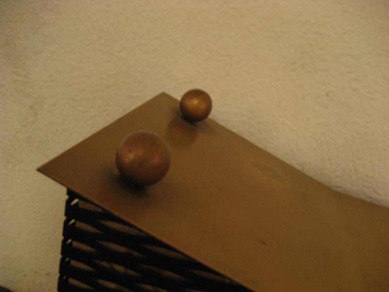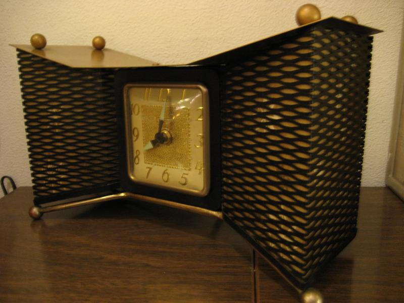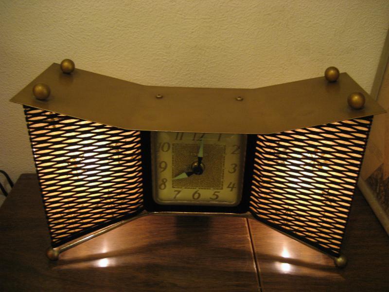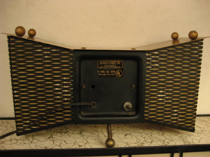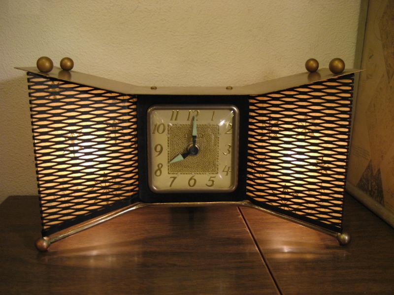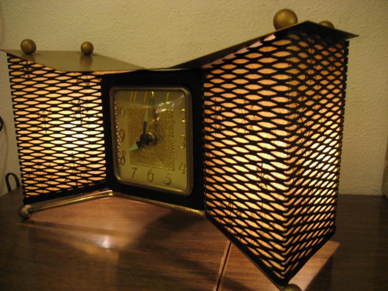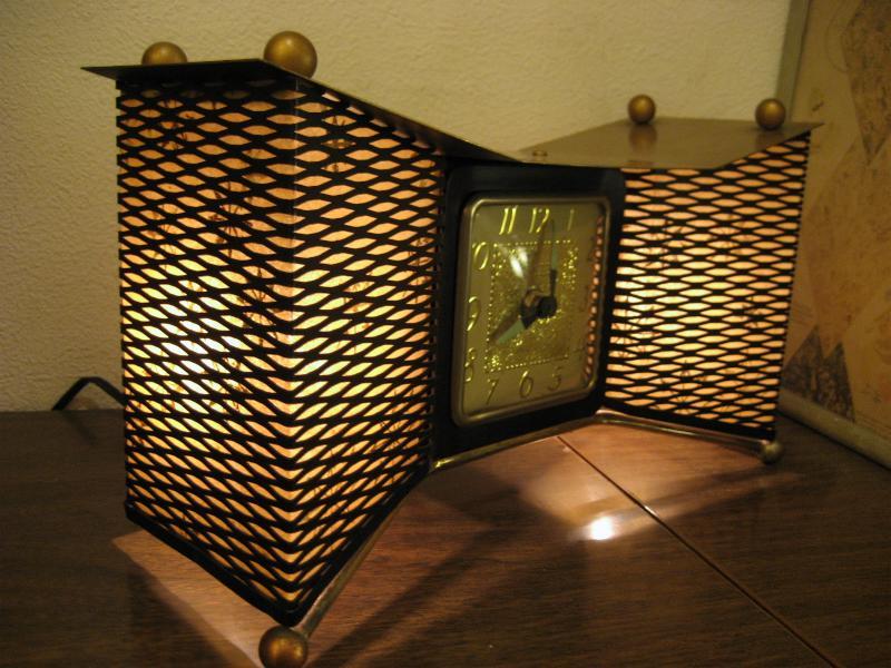 MADE IN USA. ランプ付きのアトミックシェイプ置時計です。両サイドのメッシュ部分にファイバーグラスメイドのシェードがはめ込んであり、ゴールドスターバーストプリント。3本足タイプでレッグ先とトップルーフにブラスボールデコ付。ランプ用の電源は家庭用コンセント対応コードで、スイッチは本体裏面に付いていてプッシュタイプ。時計のムーブメントはバッテリー式(単3x1コ使用)に交換済ですので時間は正確です。 クールでGOODなビンテージタイム&ライティングピース! |