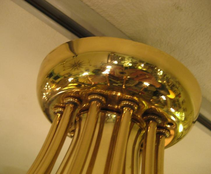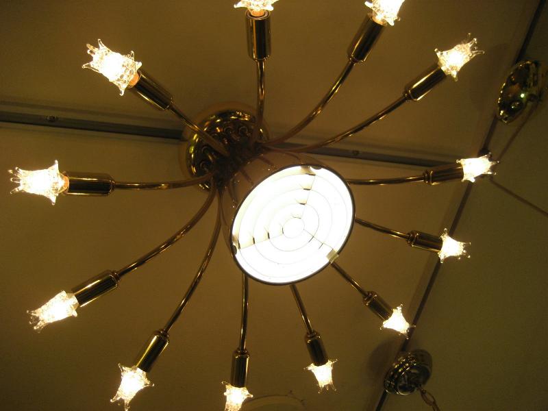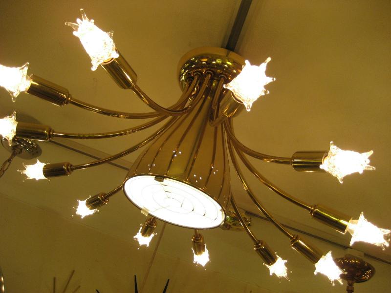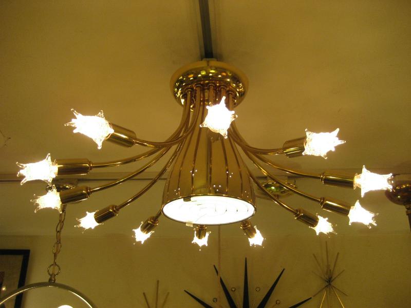 | ビンテージスプートニクシーリングランプ / 50年代 USA. 12発 (スター球12個・レギュラーバルブ1個付) クールアトミックスプートニクシャンデリア。センタースポット&12アームタイプ。スポットのまわりにシーリングカバーから出ている12本のアームがブーメランシェイプで外側へ開いたデザイン。スポット口部分にメッシュカバー付き。スーパークールでGOODなアトミックライティングピース! 電源は家庭用引っ掛けシーリングに交換済ですのでかんたん設置できます。 ※スター球:現行品 / レギュラーバルブ:アメリカ製デッドストック(40W) |