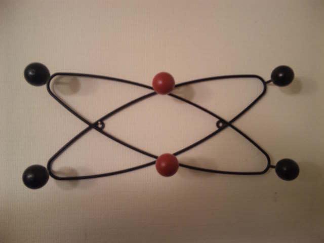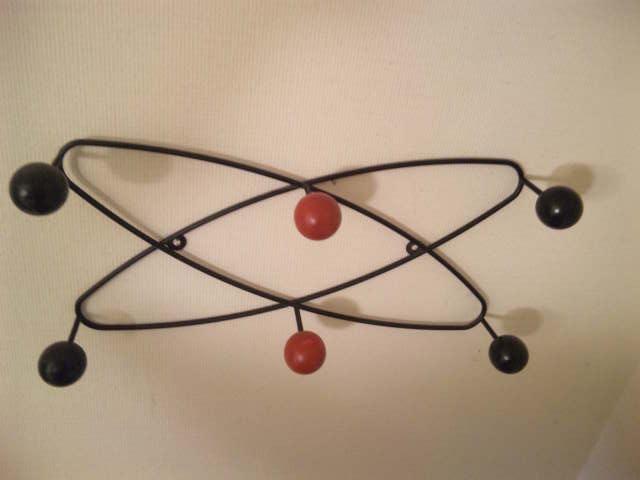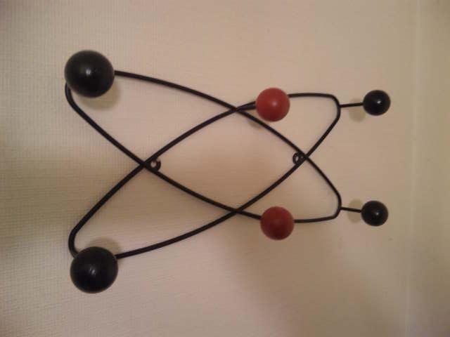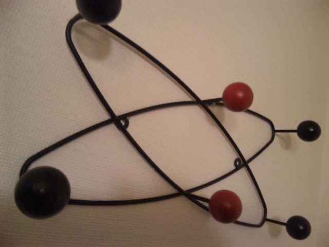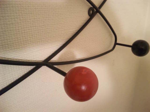 | ビンテージアトミックウォールハンガー / 50年代 USA アトミックシェイプのブラックアイアンフレームに黒赤ウッドボールアクセントの壁掛けフックハンガー。ウェアやハットなどの専用フックで、当時はゲスト用として一時的にかけておくのにも使われたようです。お部屋はもちろん玄関などにもクールでGOODなビンテージピース! |