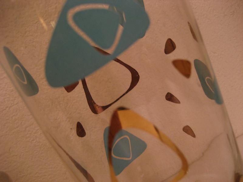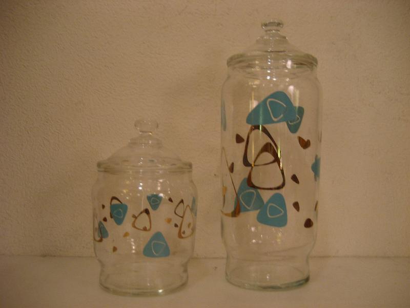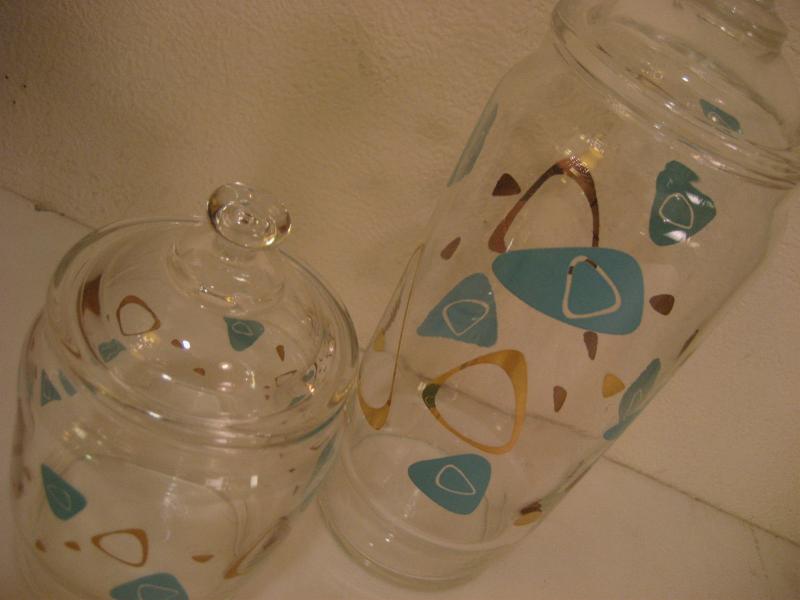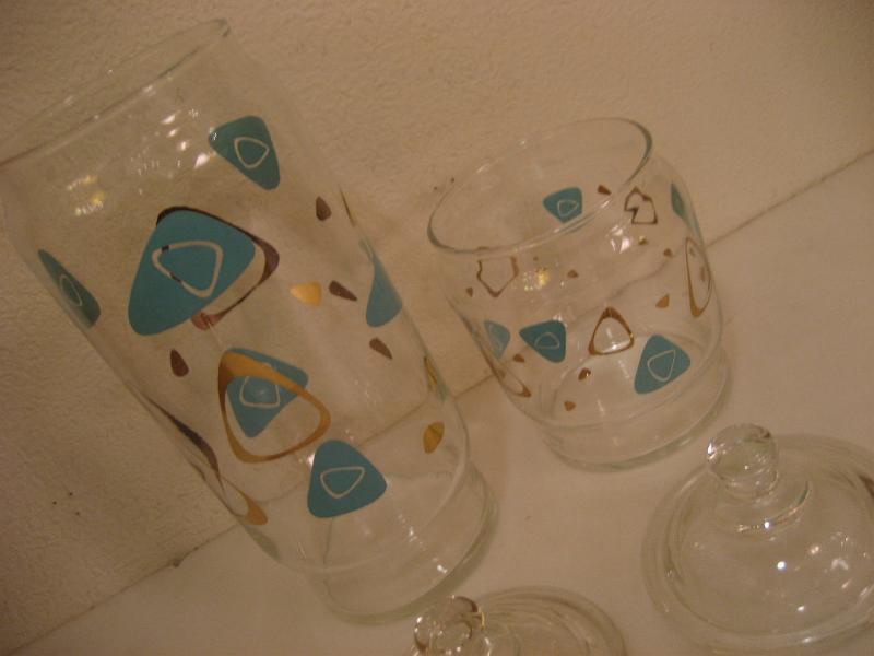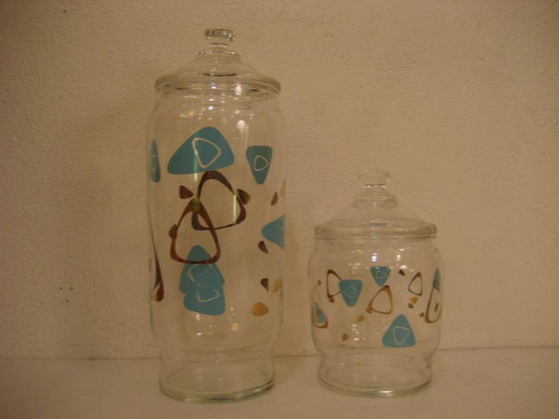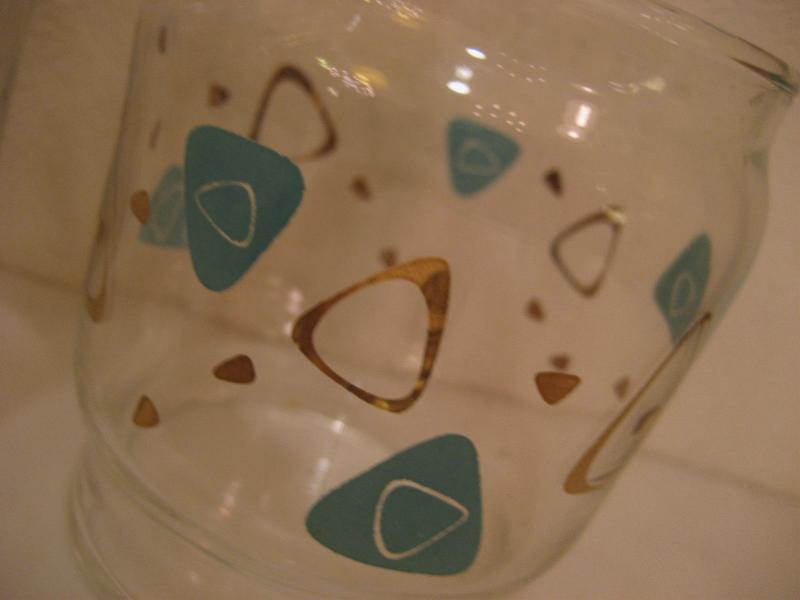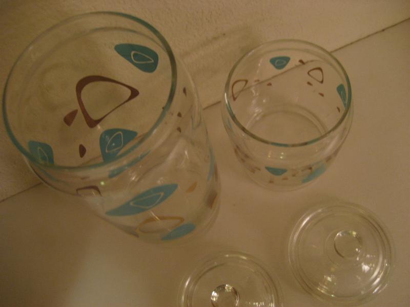 | ビンテージアトミックグラスポット / 50年代 USA アメーバブーメランプリントのガラスキャニスター。同じプリントデザインのグラスをお持ちの方も多いのではないでしょうか。。。 小物入れやディスプレイにもクールでGOODなビンテージテーブルピース! |