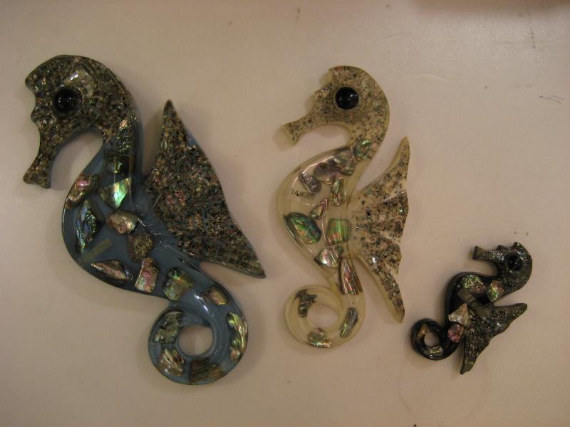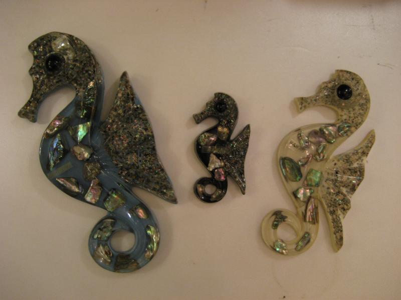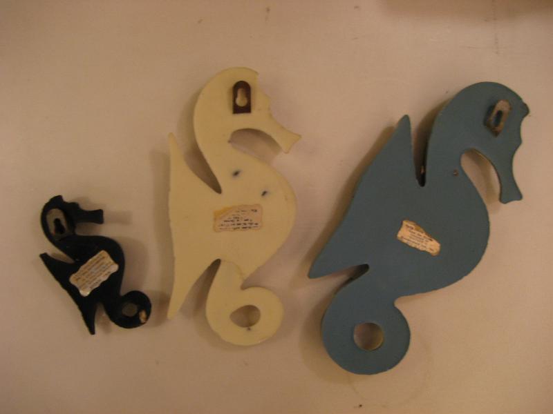 | ビンテージシーホースウォールデコ / 50-60年代 HAWAII, USA アクリル樹脂メイドのタツノオトシゴ壁掛け3pcセットです。バックベースはカラーがそれぞれ違いLargeはブルー・Mediumはオフホワイト・Smailはブラックで、それぞれにクリアアクリルボディカラーで内側は貝殻アクセント。キュートでGOODなビンテージウォールデコレーションピース! |