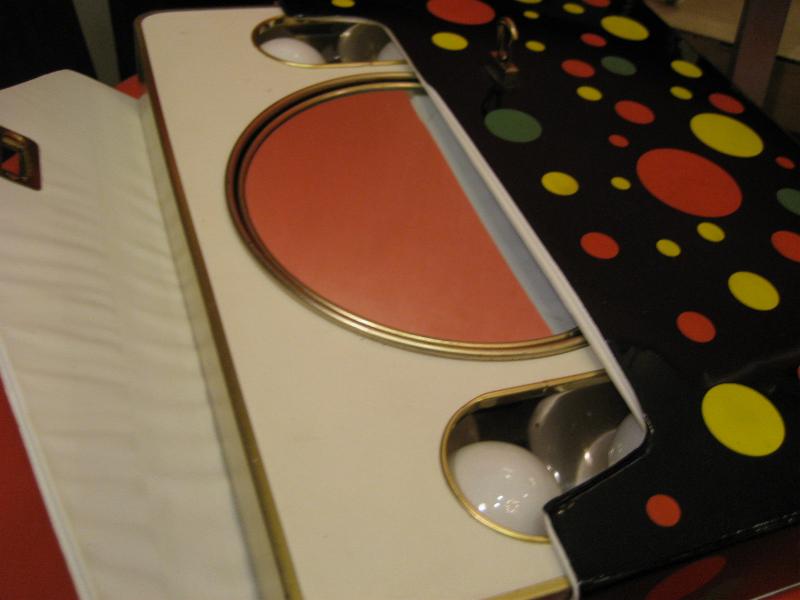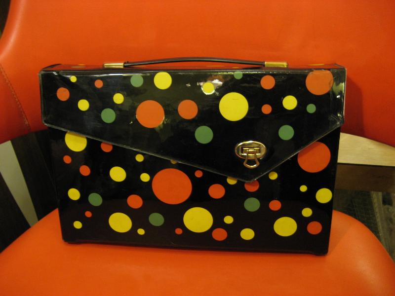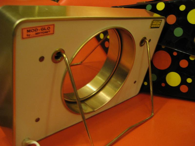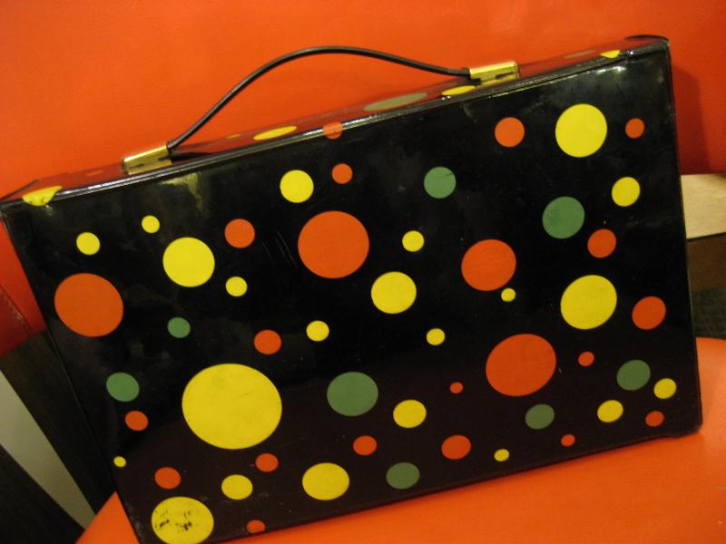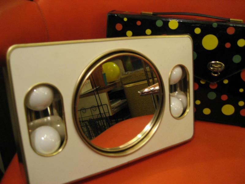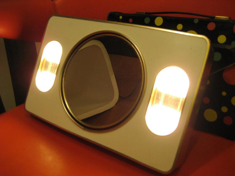 | ビンテージライトアップメイクアップミラー(キャリーケース付) / 60年代 USA 両サイドがライトアップするメイクアップ用ミラー。鏡はフラットフェイスと凹面鏡(クローズアップ用)の2種類で回転可能。収納と持ち運びに便利なブラックベースにマルチドットカラーのキャリーケース付き。。。電源は家庭用コンセント対応コードでスイッチはコード中間に付いています。クールでキュートなビンテージバニティピース! |