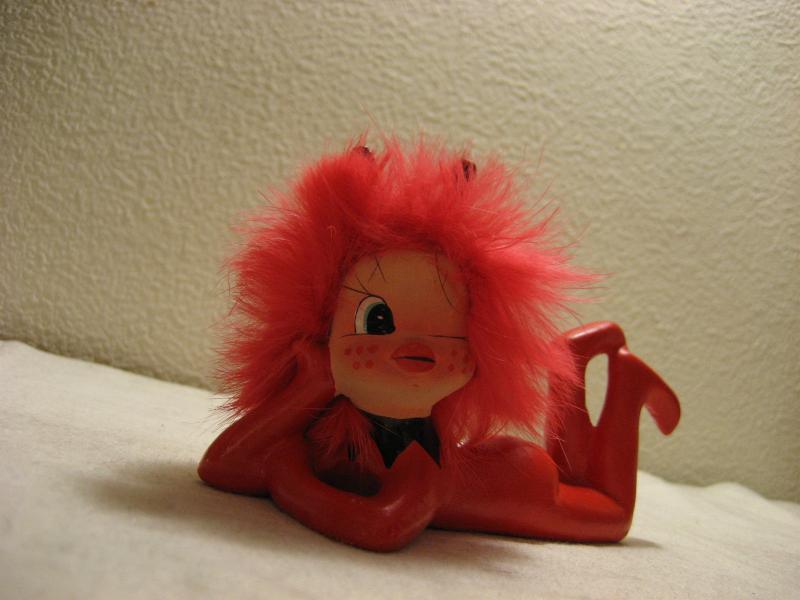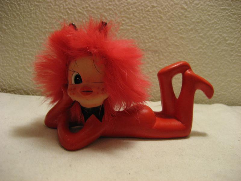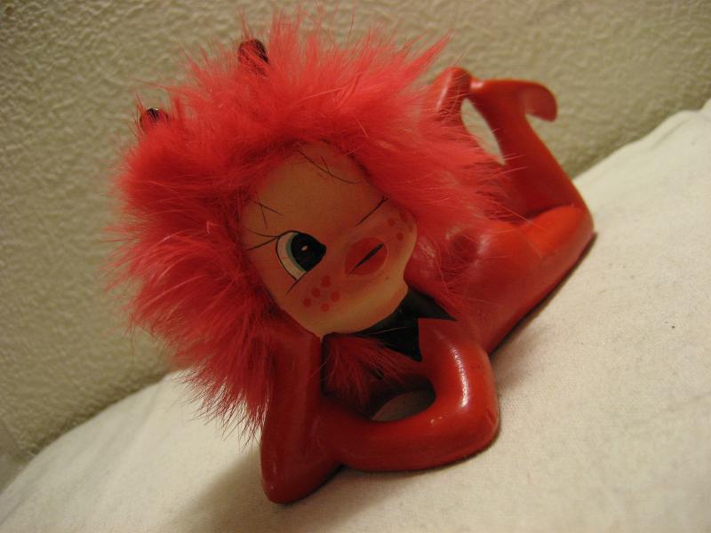 | ビンテージデビル置物 / 50年代 USA. 陶器製の女の子デビルの置物です。寝そべって頬杖ついたポーズで髪の毛はファーが付いています。シェルフなどのディスプレイにGOODなビンテージディスプレイピース! |