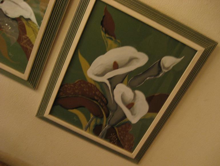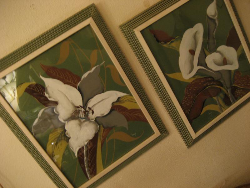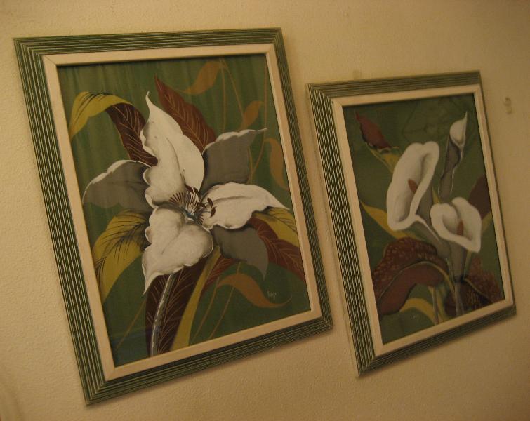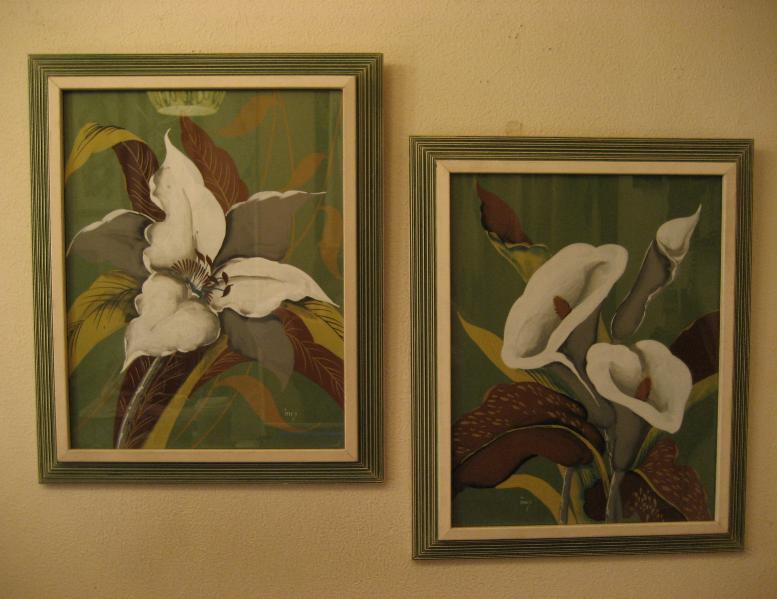 | ペアビンテージウォールデコフレーム / 50年代 USA. Signed by "inez" ターナーライクのトロピカルフラワーペイント2枚セットの壁掛けです。フレームはウッドメイドでエッジダウンタイプ、カラーはアイボリーとグリーンの筋彫りでストライプ柄。ハワイアンデコにもベストマッチではないでしょうか。。。クールでGOODなビンテージウォールデコピース! |