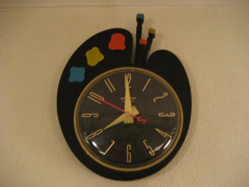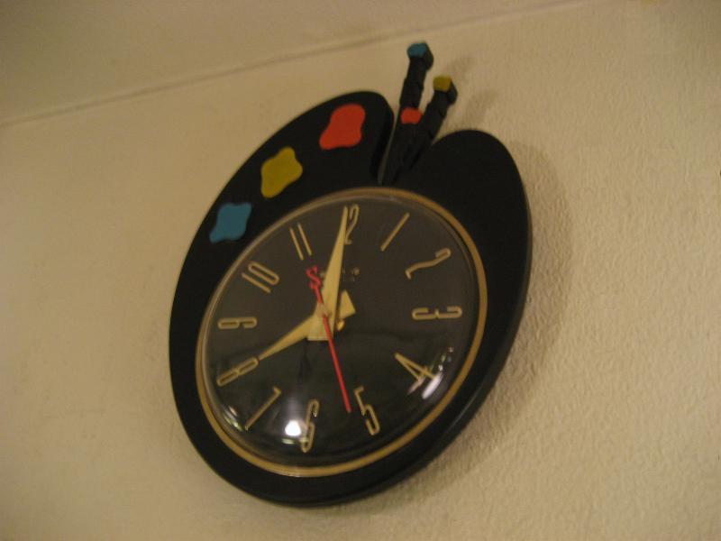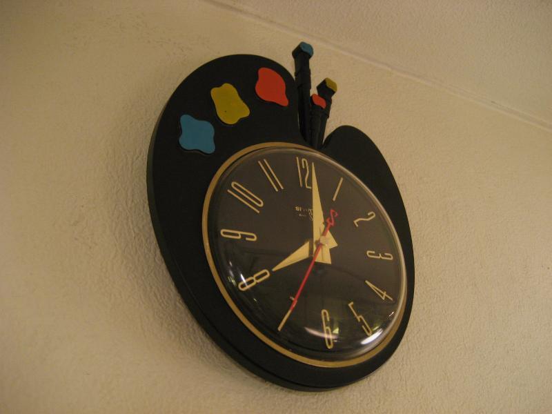 | ビンテージウォールクロック / 50-60年代 SPARTUS社, MADE IN USA. キュートなパレットシェイプのビンテージキッチンクロック。プラスチックボディで、3色の絵の具と絵筆がアクセント。キッチンやキッズルーム、もちろんどんなお部屋でもGOODなビンテージタイムピース! ムーブメントはバッテリー式(単3x1コ使用)に交換済ですので時間は正確です。 |
