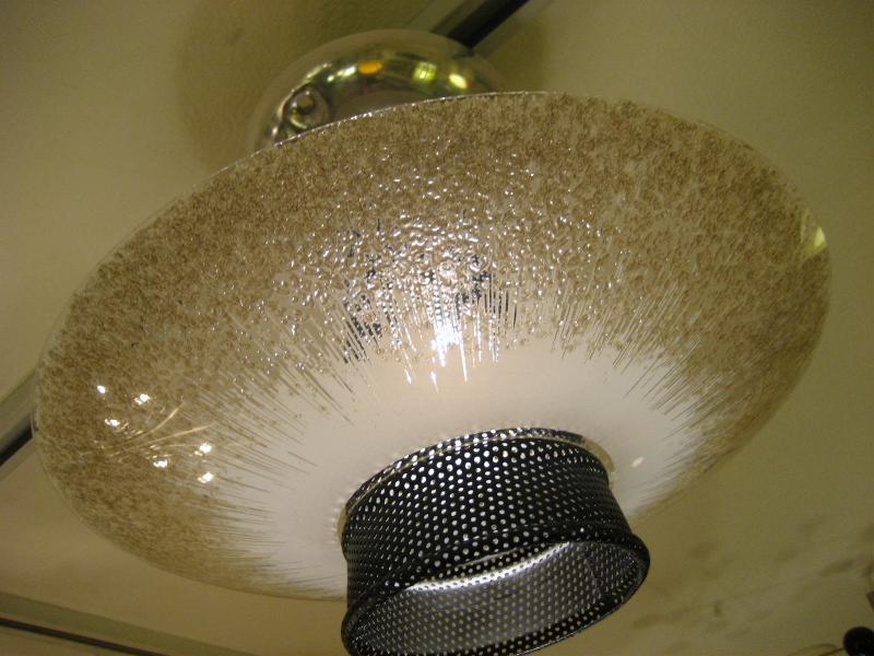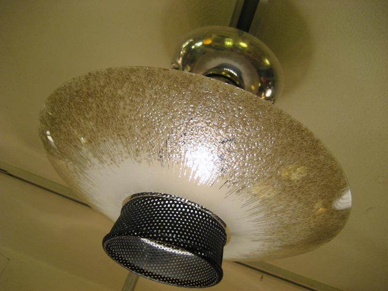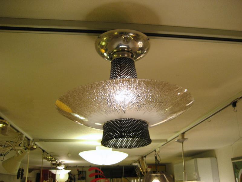 | ビンテージアトミックシーリングランプ / 50-60年代 USA ブラックメッシュスポットセンターにスターバーストタイプのUFOガラスシェードのアトミックランプ。玄関や廊下、お部屋のアクセント照明としてもクールでGOODなビンテージライティングピース! 電源は引っ掛けシーリングに交換済みですのですぐに設置可能です。 |