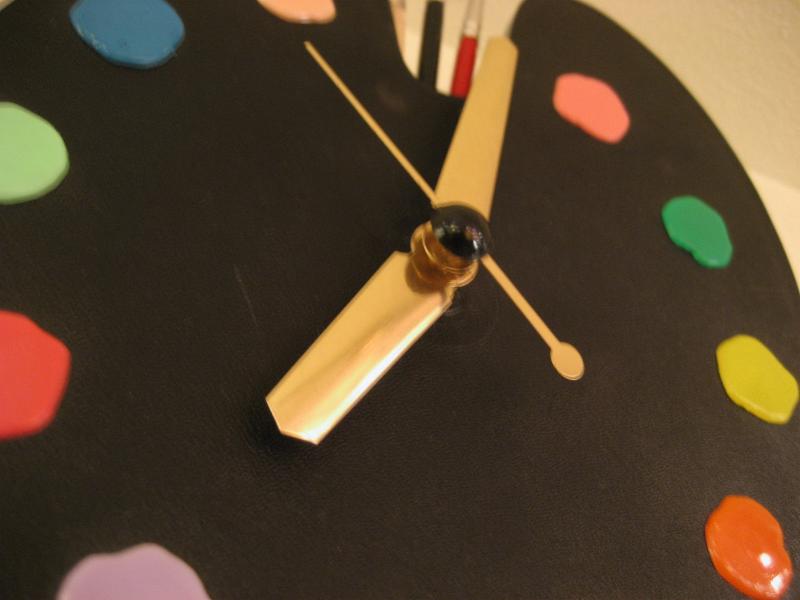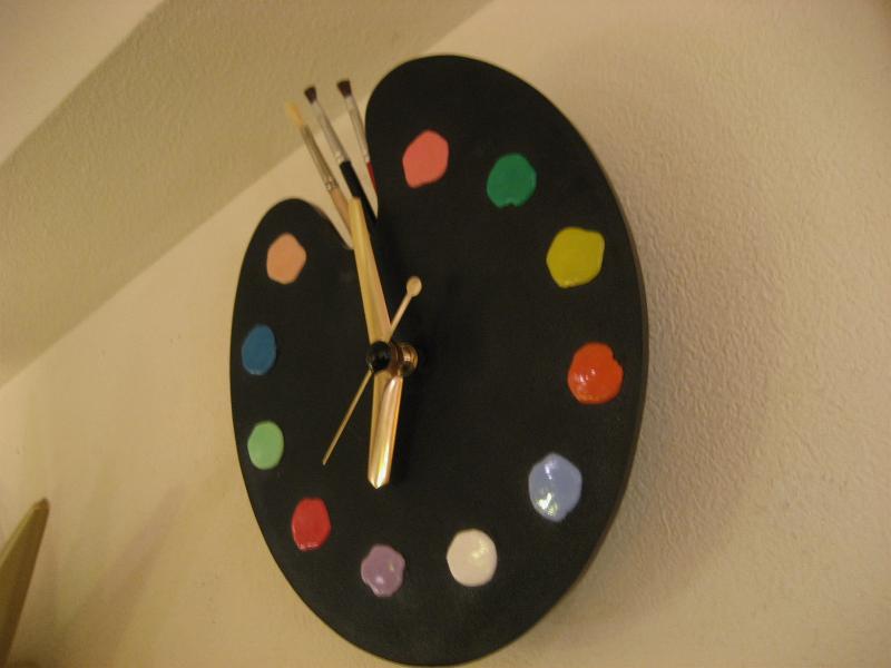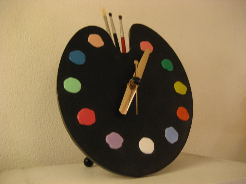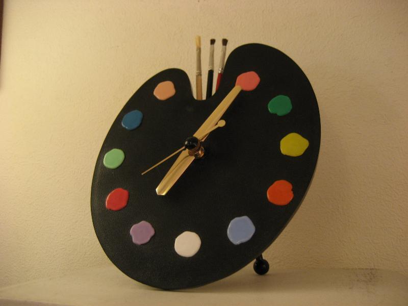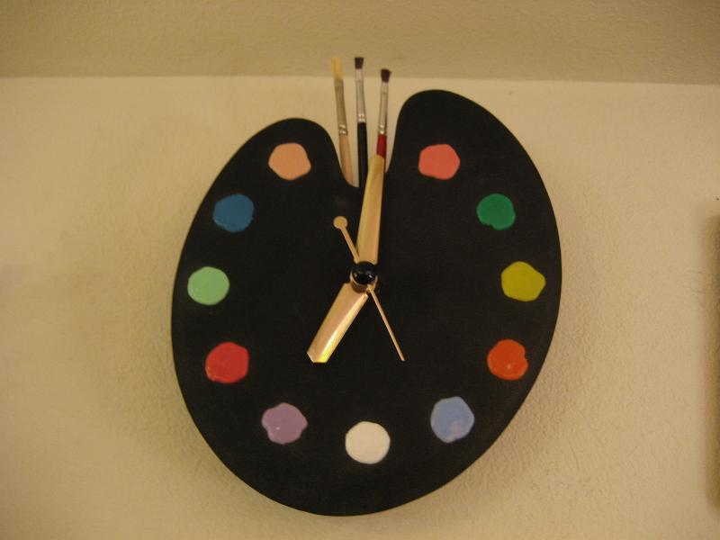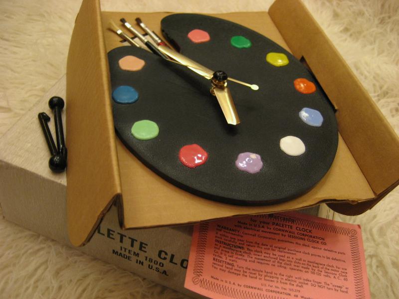オリジナルBOX付 パレットシェイプのビンテージクロック。プラスチックボディにインデックスは11色の絵の具、12時位置に本物の絵筆がアクセントに。。。 壁掛けと、スタンドピンが付いているので置時計としてもディスプレイOK! キッチンやキッズルーム、もちろんどんなお部屋でもGOODなビンテージタイムピース! ムーブメントはバッテリー式(単3x1コ使用)に交換済ですので時間は正確です。 |