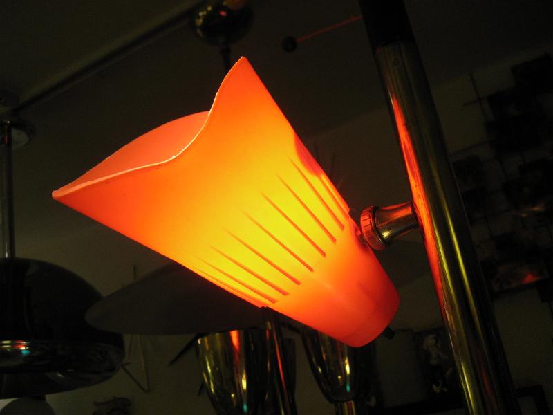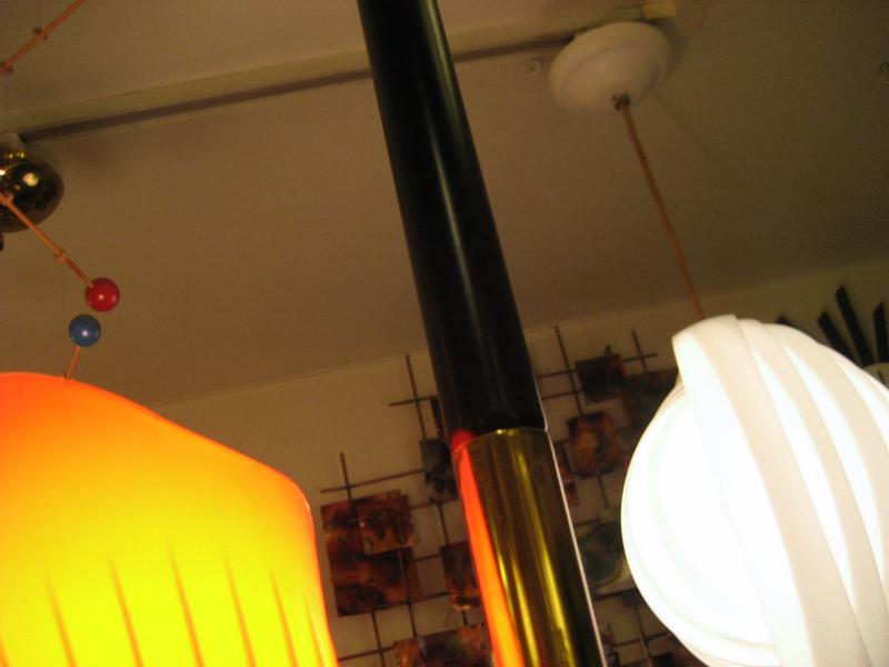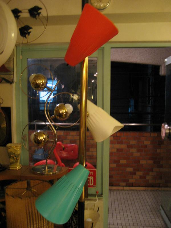 | ビンテージアトミックフロアポールランプ / 50-60年代 USA. Snyder社製 オリジナルBOX付き ミッドセンチュリーの定番的ライティングピースと言える3スポットビンテージフロアランプです。天井と床に突っ張らせるスプリングロッドタイプでシェードは3カラーのプラスチックメイド、ロッド(ポール)はブラックとゴールドのツートーン。 電源は家庭用コンセント対応コードで、スイッチは各シェード後部にそれぞれ付いています。 |