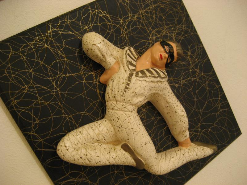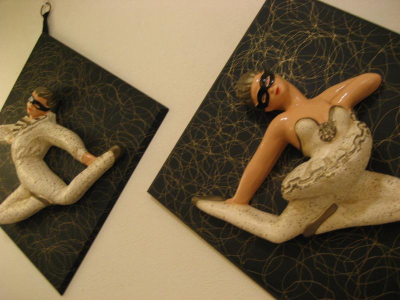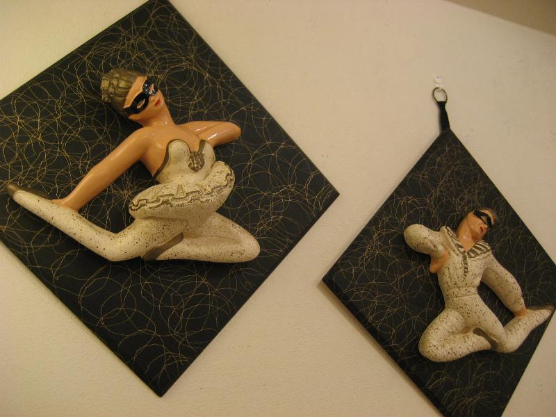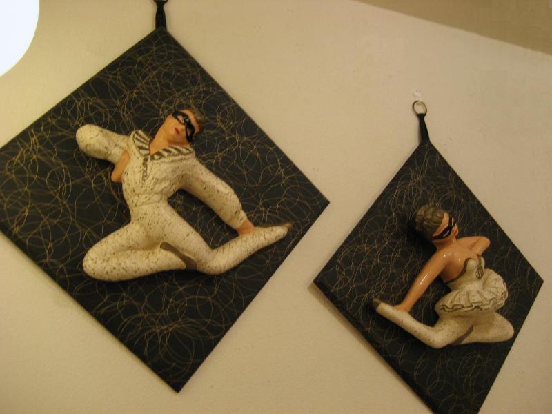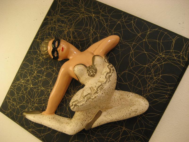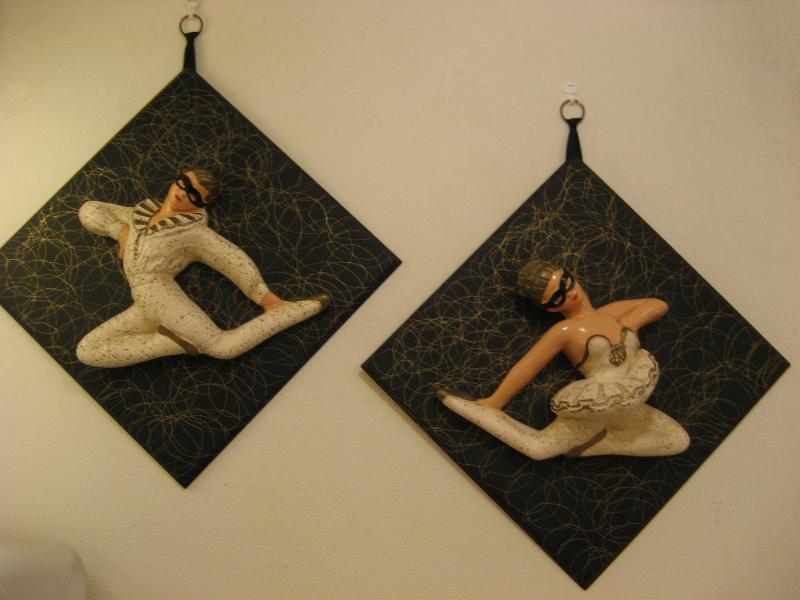 | ビンテージハーレクインウォールデコ 50年代 USA. ペアハーレクインダンサー壁掛け。ブラックにゴールドドレーピングアクセントのウッドメイドベースにチョークメイドデコ。クールでGOODなビンテージウォールデコレーションピース! |