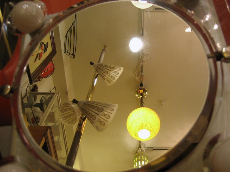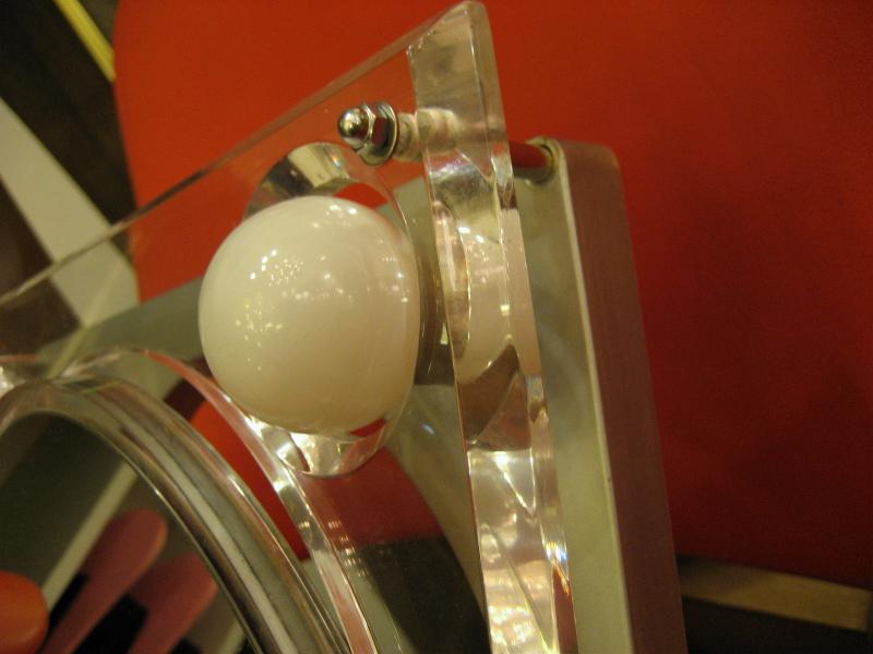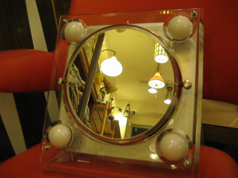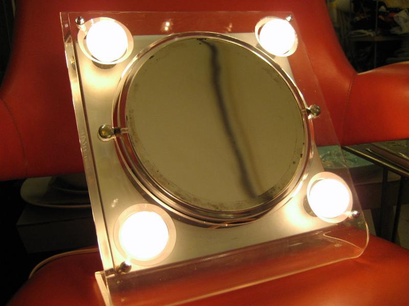 | ビンテージライトアップメイクアップミラー / 60年代 USA 4コーナーがライトアップするメイクアップ用ミラー。分厚いアクリルフレームのL字スタンドタイプで鏡はフラットフェイスと凹面鏡(クローズアップ用)の2種類で回転可能。電源は家庭用コンセント対応コードでスイッチはコード中間に付いています。クールでキュートなビンテージバニティピース! |